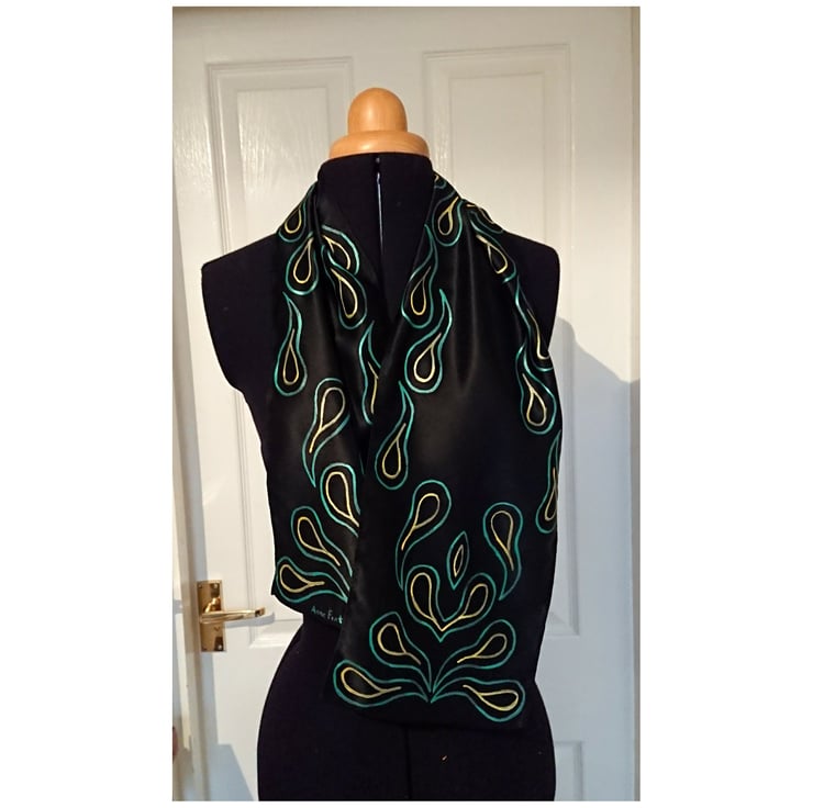Black silk satin scarf with green and yellow paisleys handpainted onto 100% silk crepe backed satin – 1 in stock.
