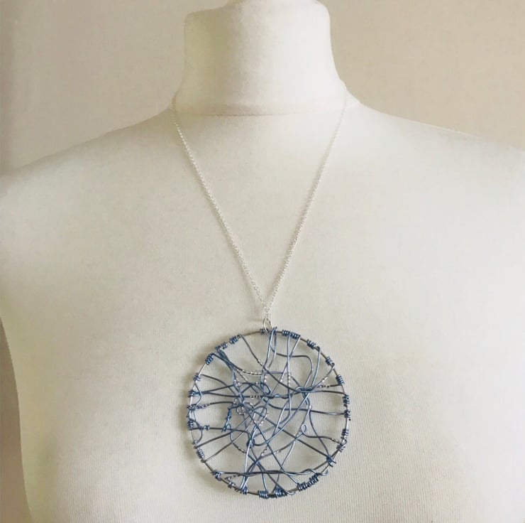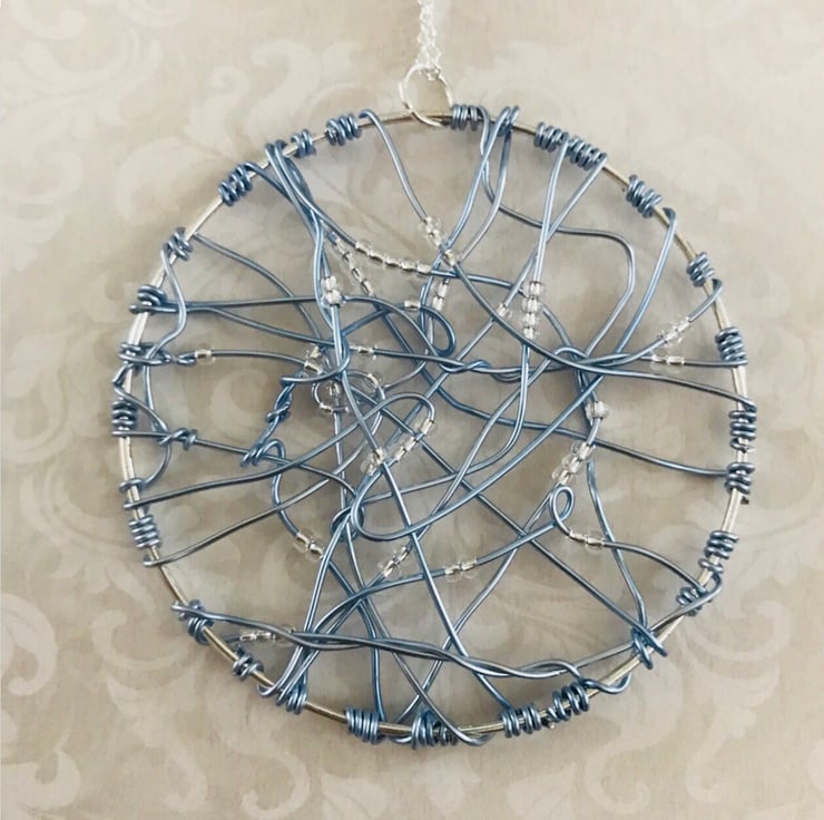 Statement pale blue wire & silver lined ,clear preciosa beaded ,abstract ,pendant web necklace. Pendant measures approx 7cm diameter. Hung on a 20 inch chain with lobster clasp.