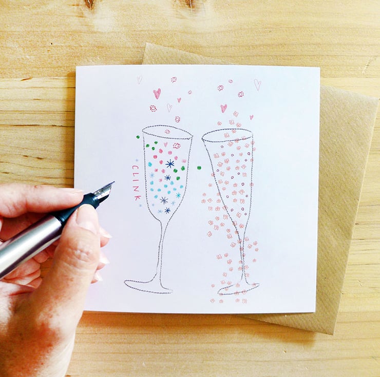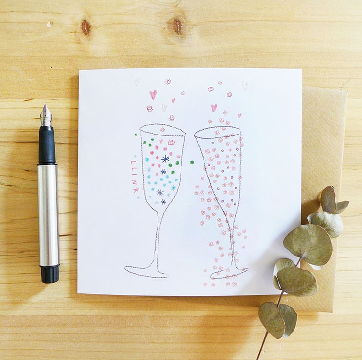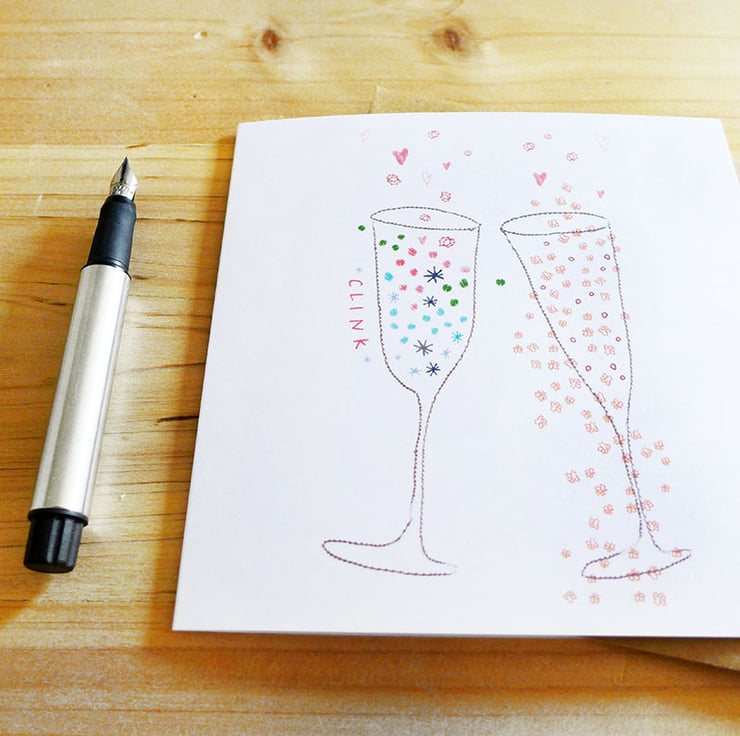 A gorgeous card for all occasions worth celebrating with fizz! Featuring Charlotte's embroidered illustrations of champagne glasses and added hand-illustrated elements.