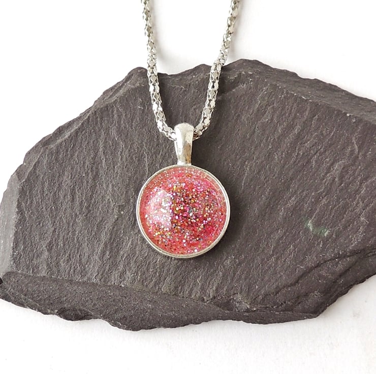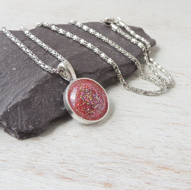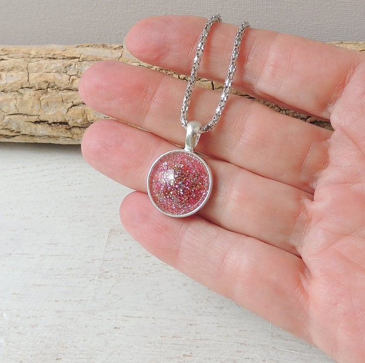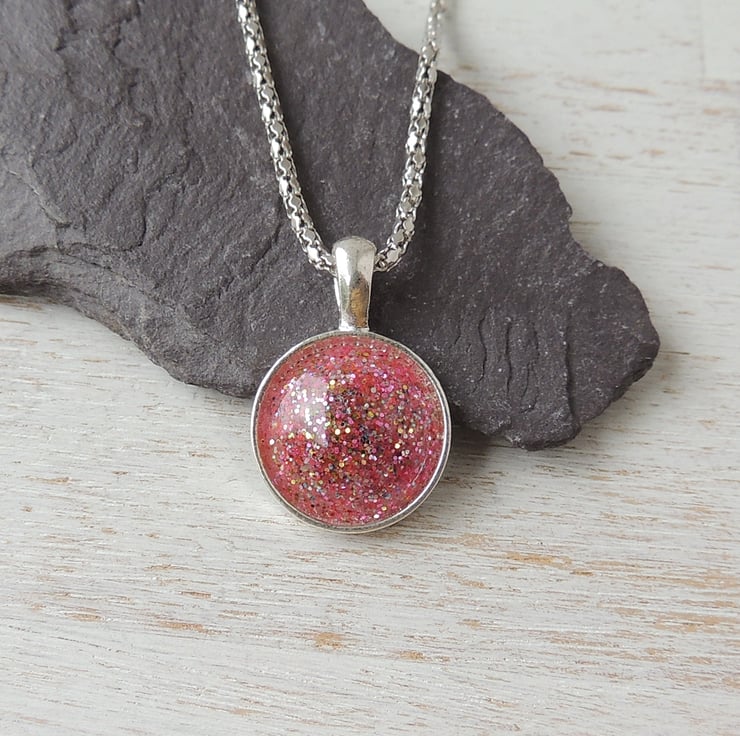 I used lots of glitter in pink resin to make the cabochon which I then set into the cup of a silver plated pendant bezel.