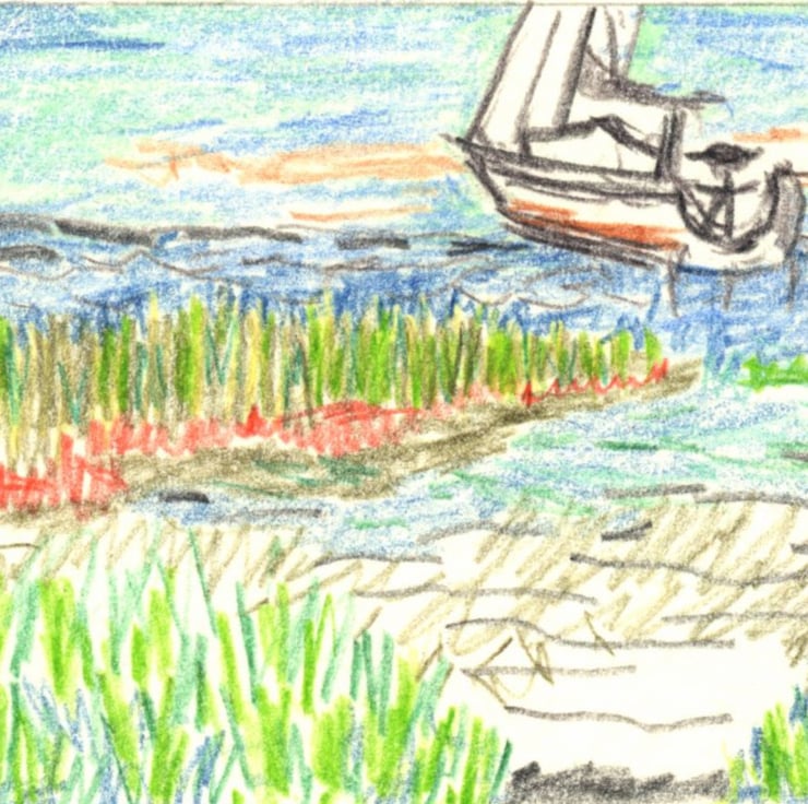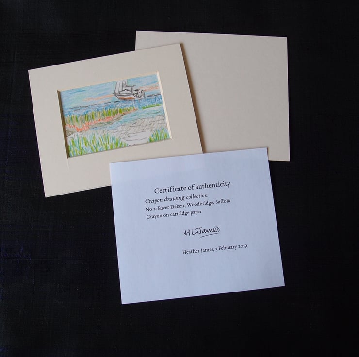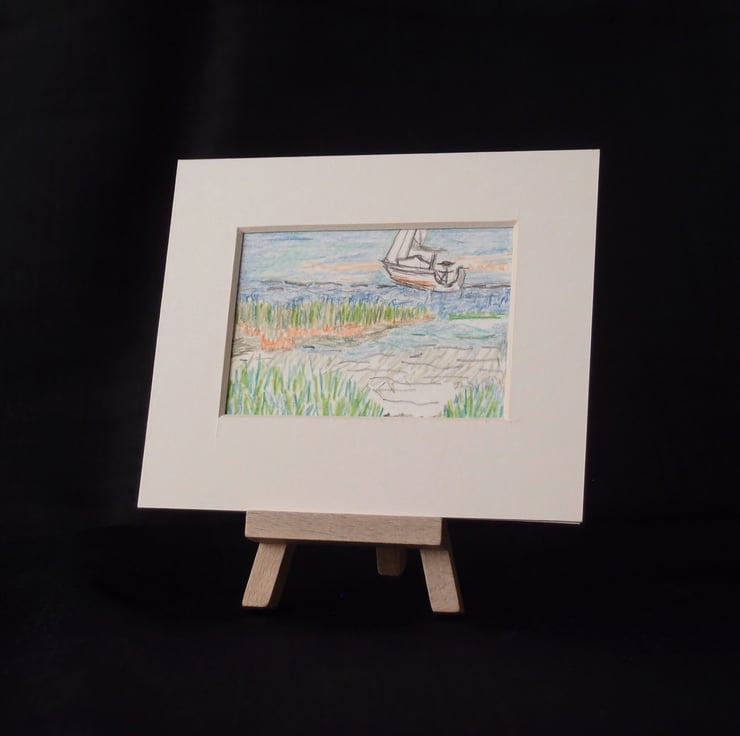This is the second ACEO in my crayon collection of 10 drawings. It was sketched on location during a walk along the River Deben using crayon on cartridge paper on the same day as my first listed ACEO. The dimensions are: 3.5 x 2.5 inches (89mm x 63mm). It comes packed in a cello bag to protect it with a mount (which measures approximately: 5.5 x 4.5 inches, or 137 x 115mm) and backing board plus a certificate of authenticity that I have signed. It also includes a mini easel so you can display it on a mantel piece or, alternatively have it framed. The sketch is not attached to the backing board to make it easier to display it in another way.