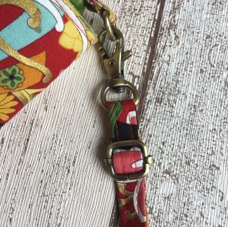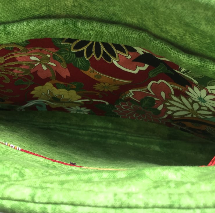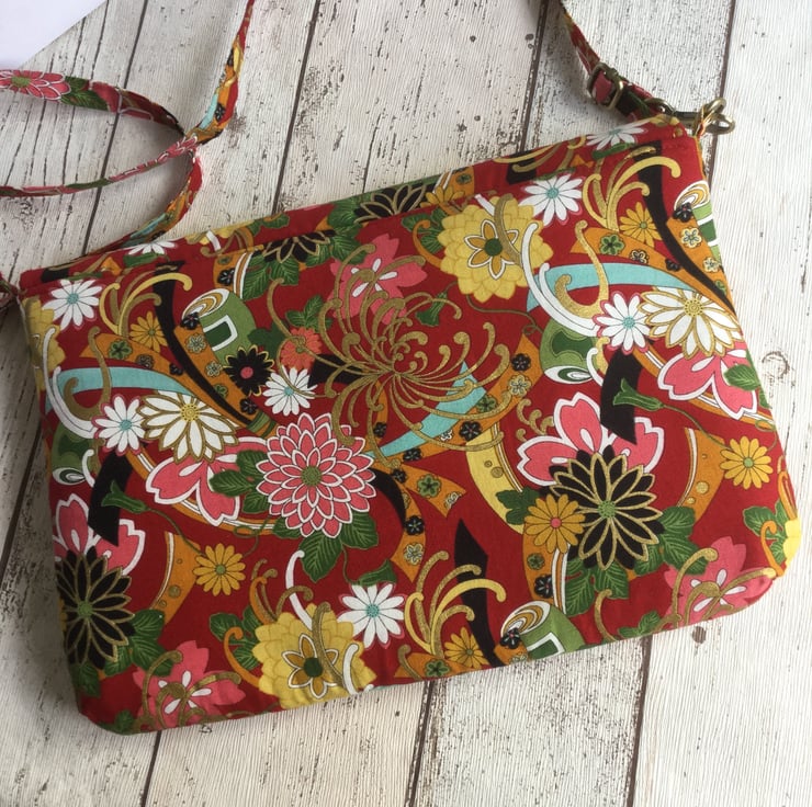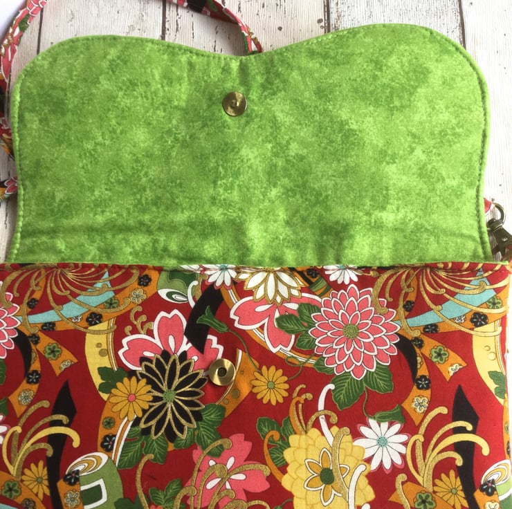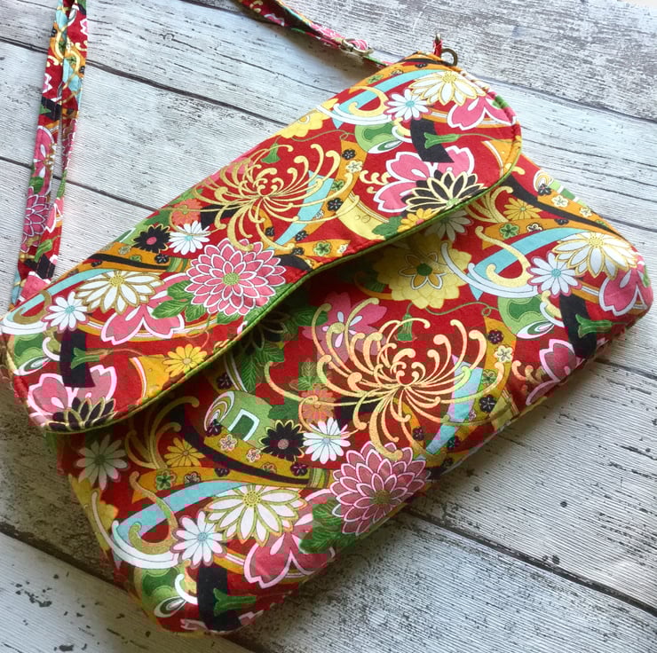 This beautiful Japanese fabric has a busy multi coloured floral design on a deep red background and the shiny gold swirls give it a 3d feel. This classic design shoulder bag has a curvy flap with a magnetic snap closure and the main bag is darted to give depth. The shoulder strap in the same fabric is adjustable and removable.