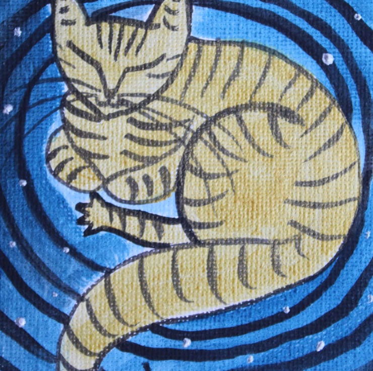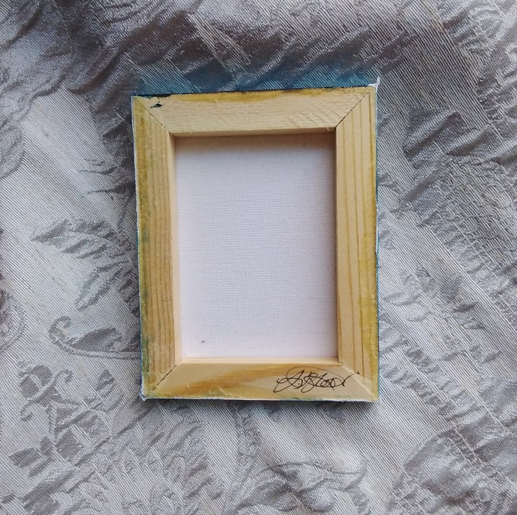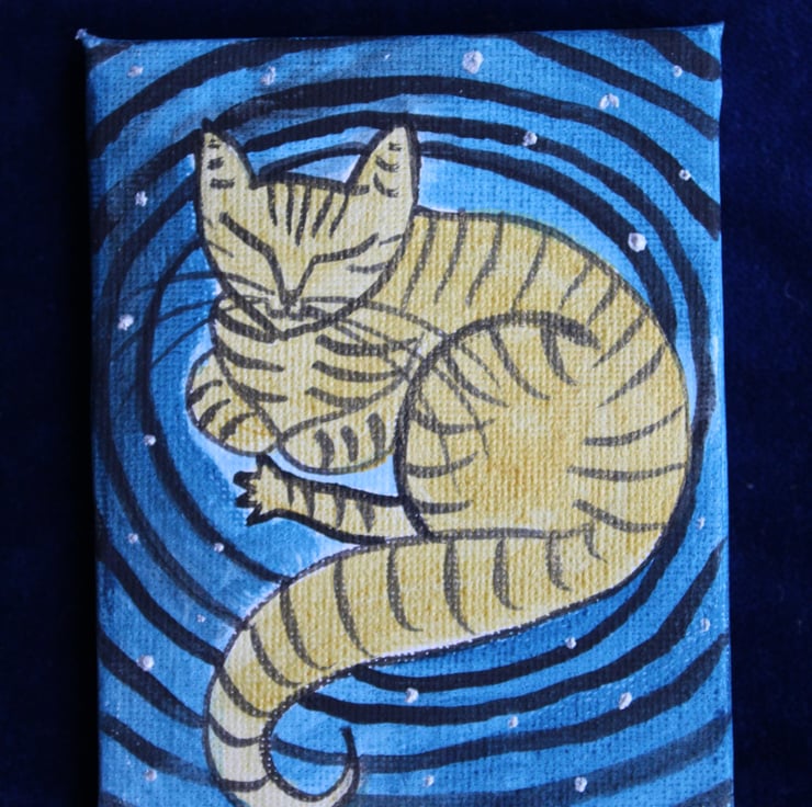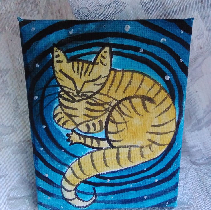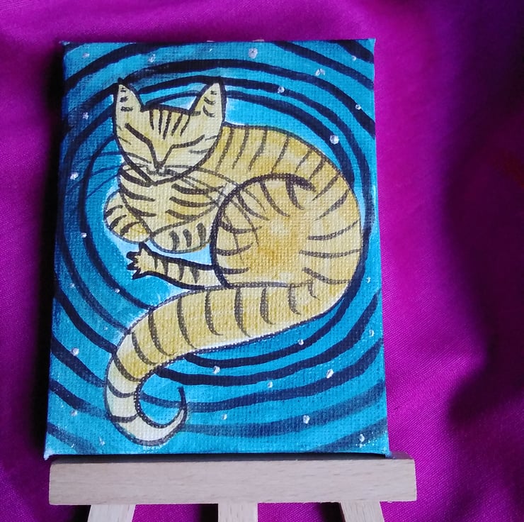Mini-Art. An original, one-off, hand-painted feline portrait in acrylic paint, on a pocket-sized canvas. The canvas has been mounted on a light wooden stretcher..