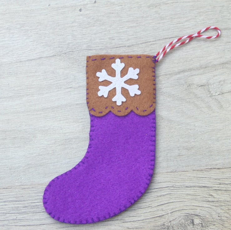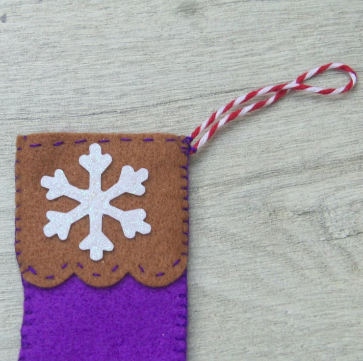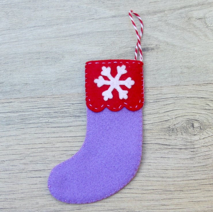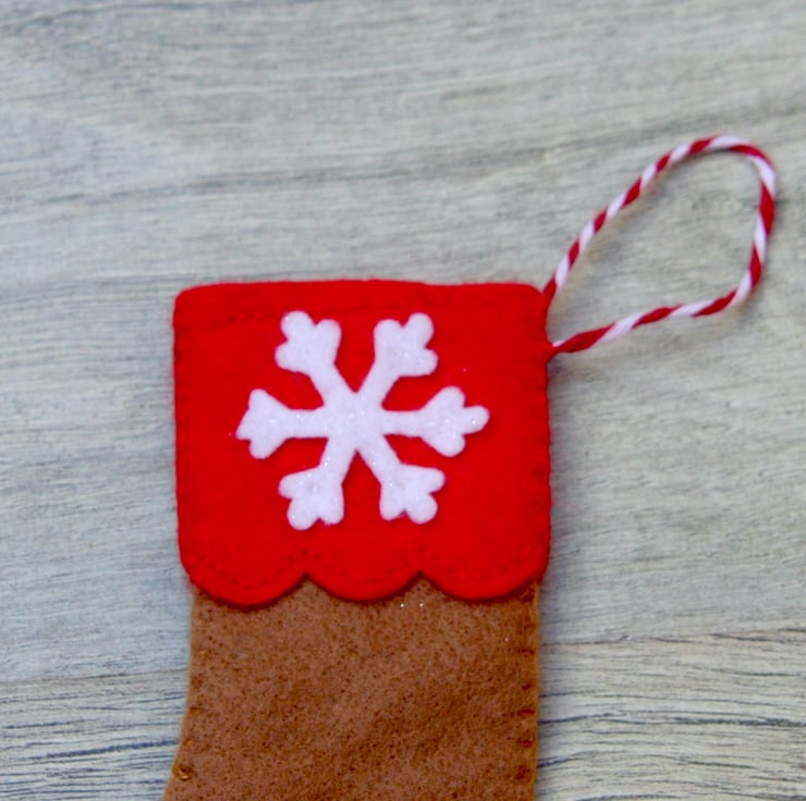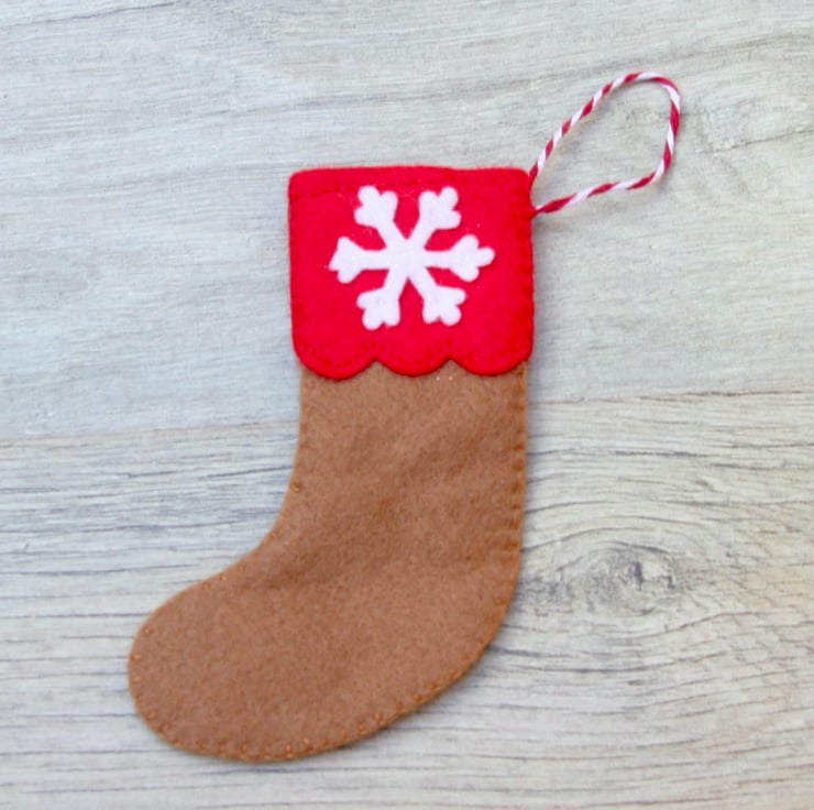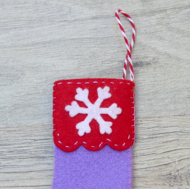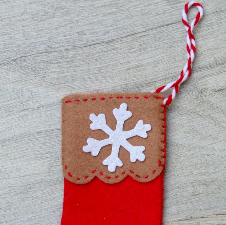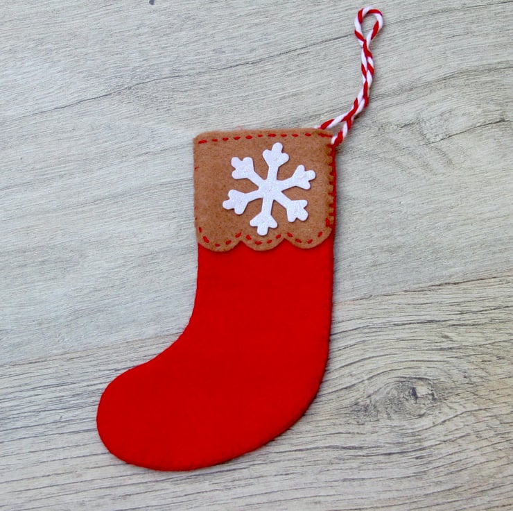 The stocking is approximately 12cm tall (not including loop hanger) and made of wool blend felt with a white snowflake motive sewn on both sides to add sparkle. The loop is made with red and white twine and is approximately 6cm. The item can be personalised with a name and/or date, please ask for a custom order.