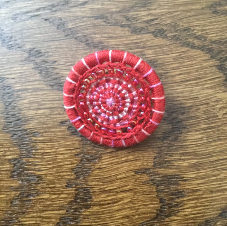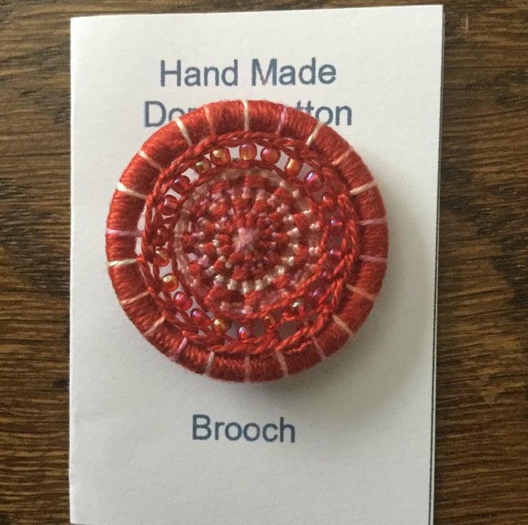 The main colour is a russet shade with the spokes laid in a contrast shade of variegated pale pink. The tiny glass beads are added to the button as part of its construction and so are totally secure. The patterns of spokes and ridges worked is created by the artist as the mood takes and so will not be repeated.
