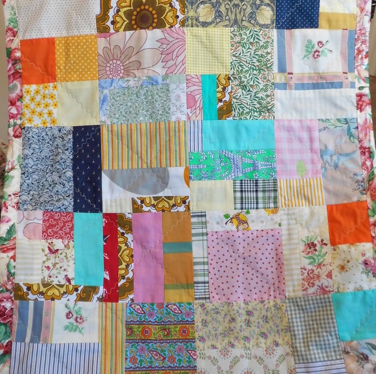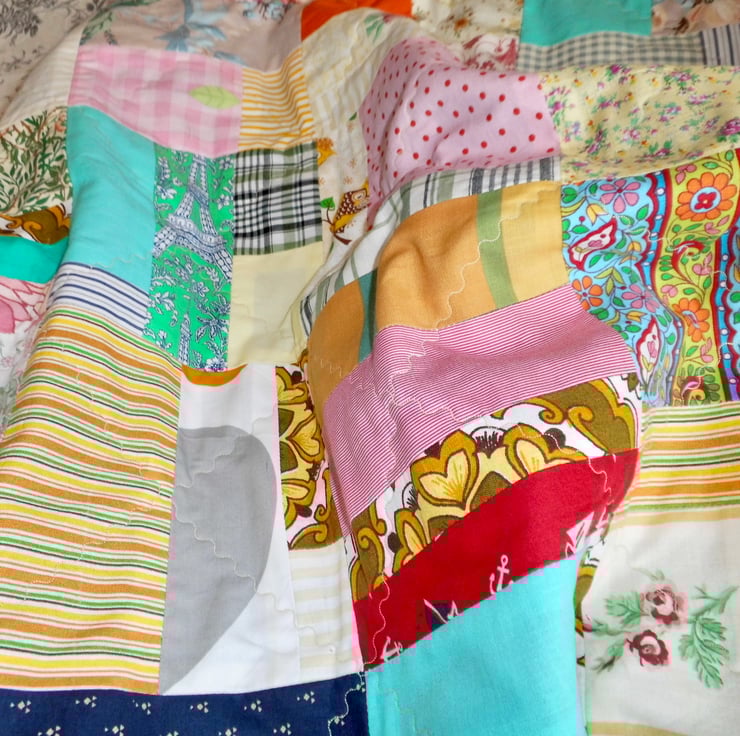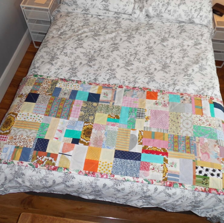 I save all the fabric off cuts from my other projects and join them together to make patchwork, sometimes in squares and sometimes more random like this quilt. Lengthy work, but very satisfying!