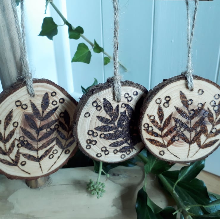 Each wood slice is unique as I hand draw each design onto the slices before I burn and they then take on their own personality.