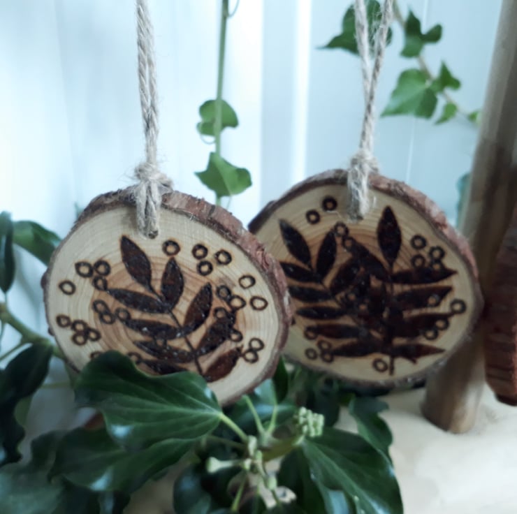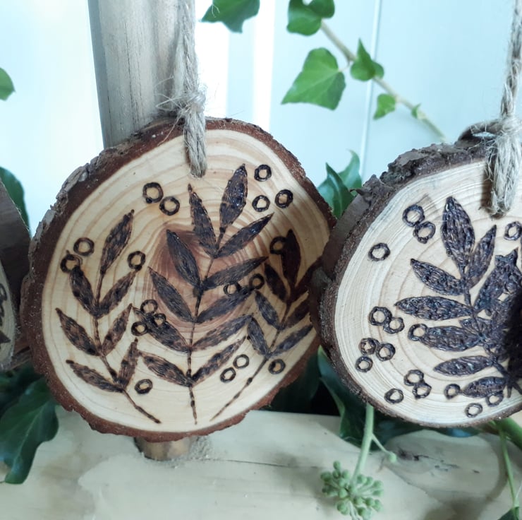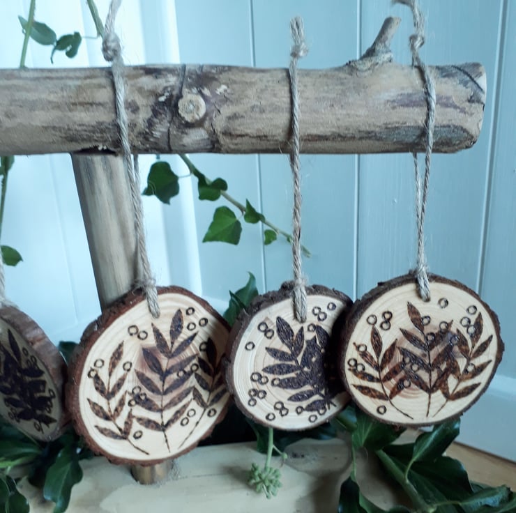 Five wood slices illustrated with rowan berries & leaves using pyrography (wood burning).