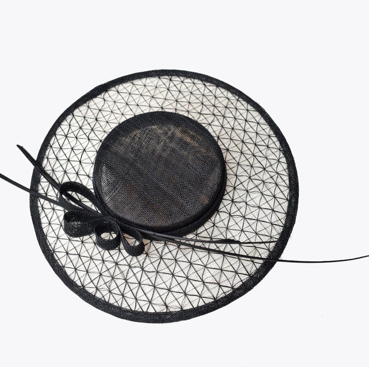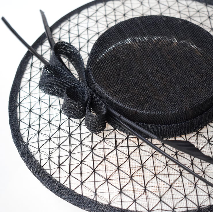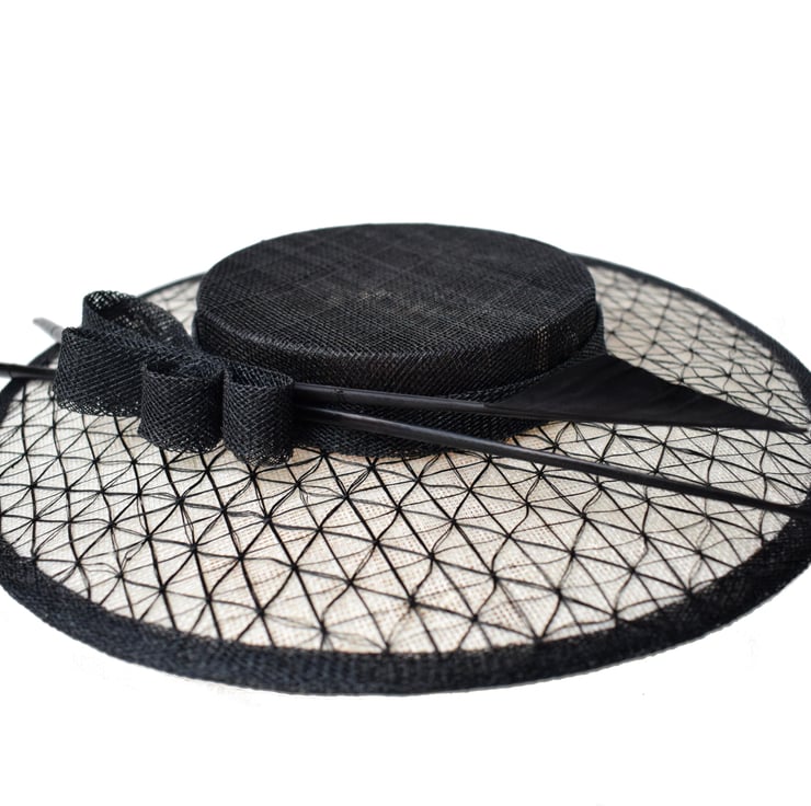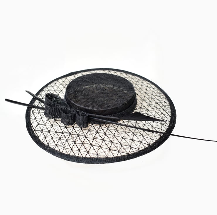 Grace is a glamourous perching boater style hat designed to sit at the front of the head. Feather quills and a chic sinamay bow complete the look for a modern silhouette. Shown here in BLACK with IVORY brim for a contemporary style, it can be customised to your outfit on request.