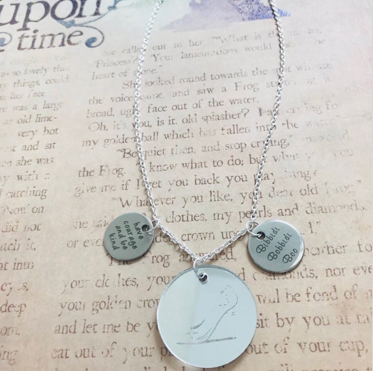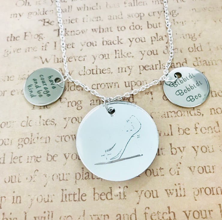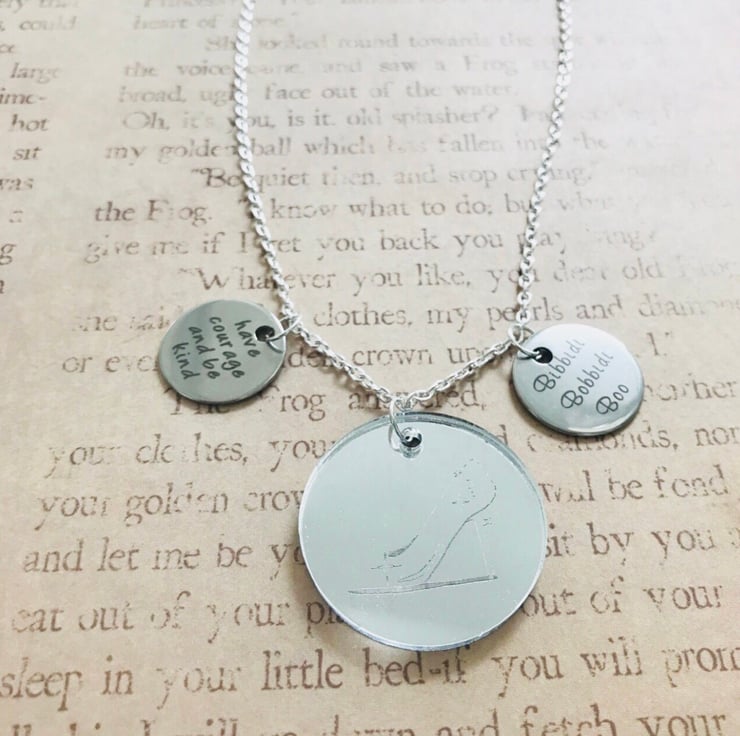 Disney Cinderella inspired charm necklace. Made with 2 2cm quotes from the story/film. “Have courage and be kind” & “bibbidi bobbidi boo”. 3.4cm Mirror glass slipper etched charm sits centre. 18 inch chain with lobster clasp.