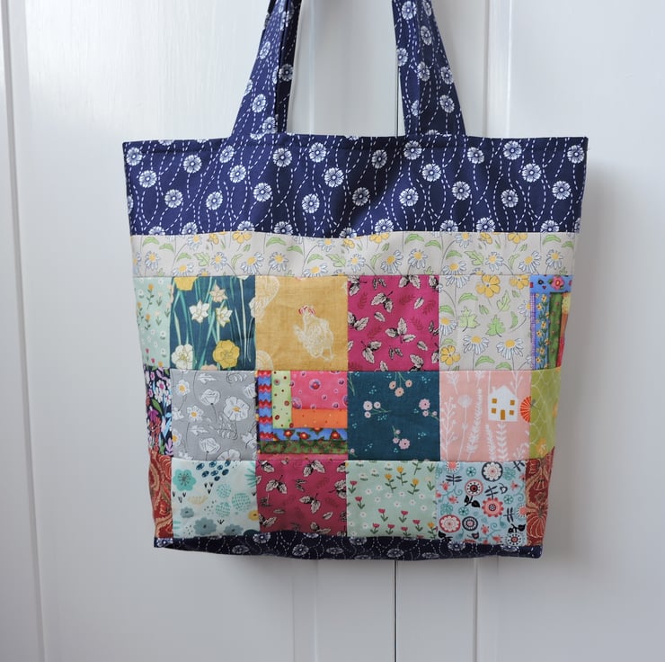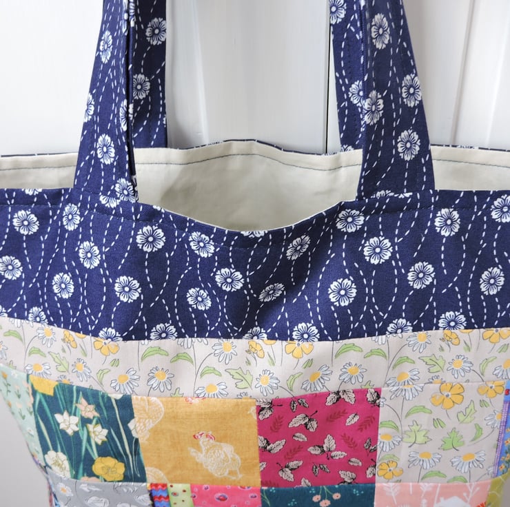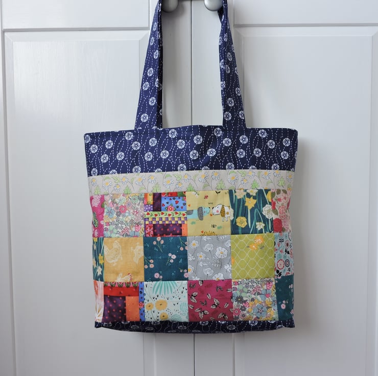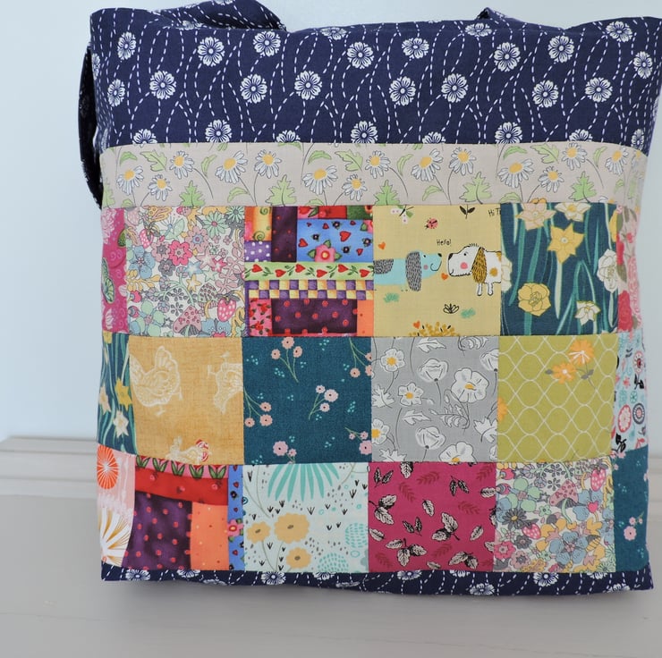 This eco rainbow coloured patchwork tote bag, shopping bag, book bag, craft bag has been made with off cuts of cotton fabrics. Assorted patterned fabrics in navy blue, yellow, grey, pink, aqua and green. It is fully lined with a plain cream cotton fabric and has a squared off bottom. This bag folds easily to fit in a pocket, bag or suitcase making it the perfect resuable tote bag.