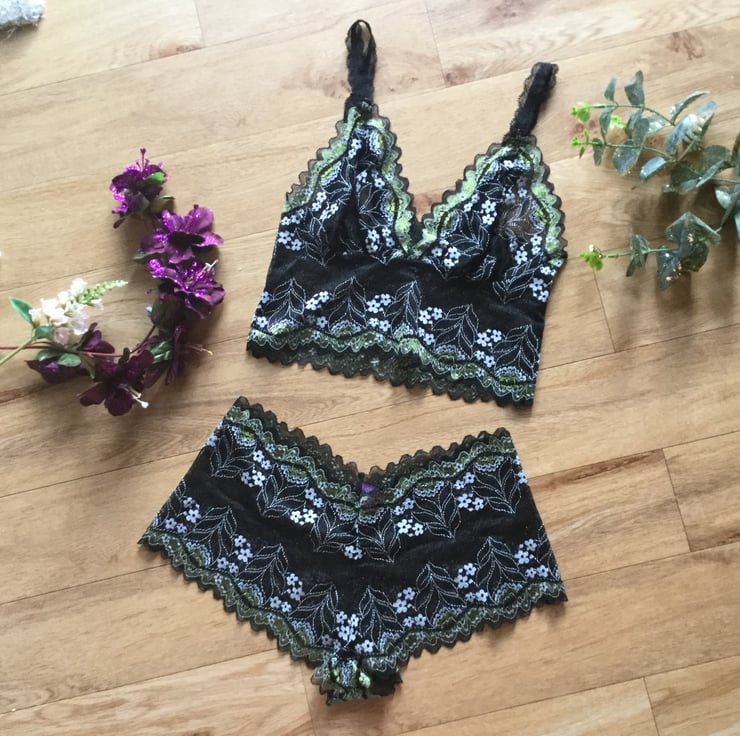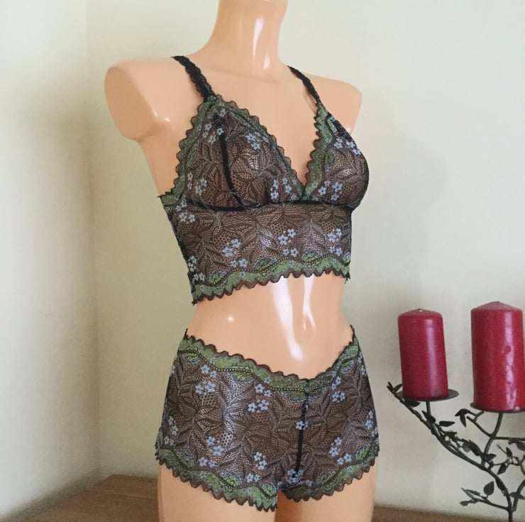 Classically beautiful stretch bralette and panties set, by fidditchdesigns.