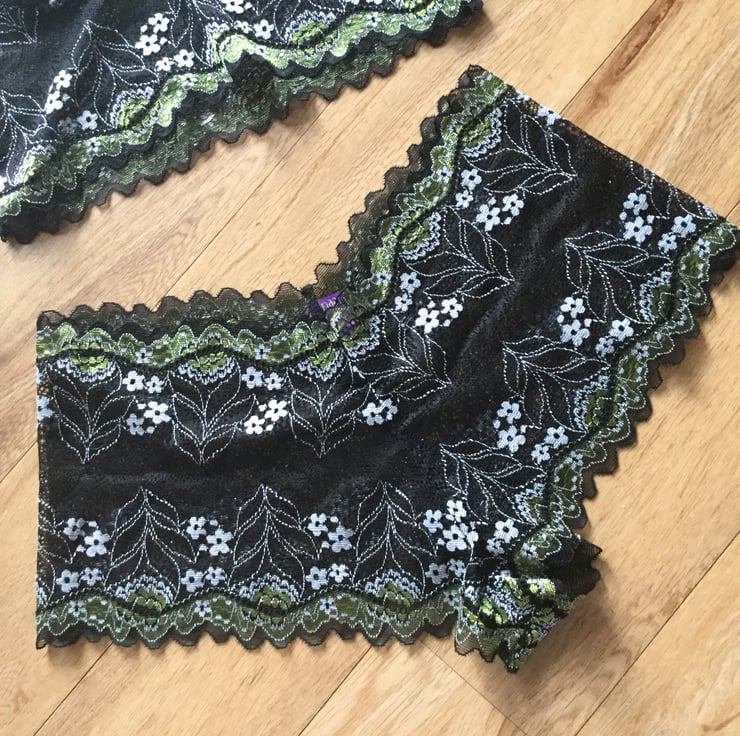 it has a really pretty but unusual design of white flowers with a green border on a picot edge black lace.