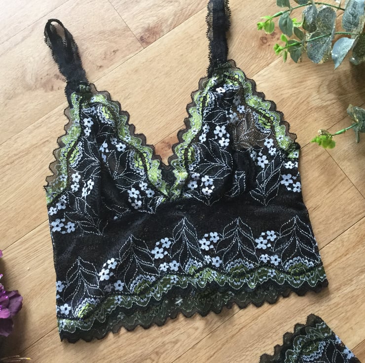 The bralette is a plunge front classic cupped style with a wide underband and adjustable lace and elastic straps.