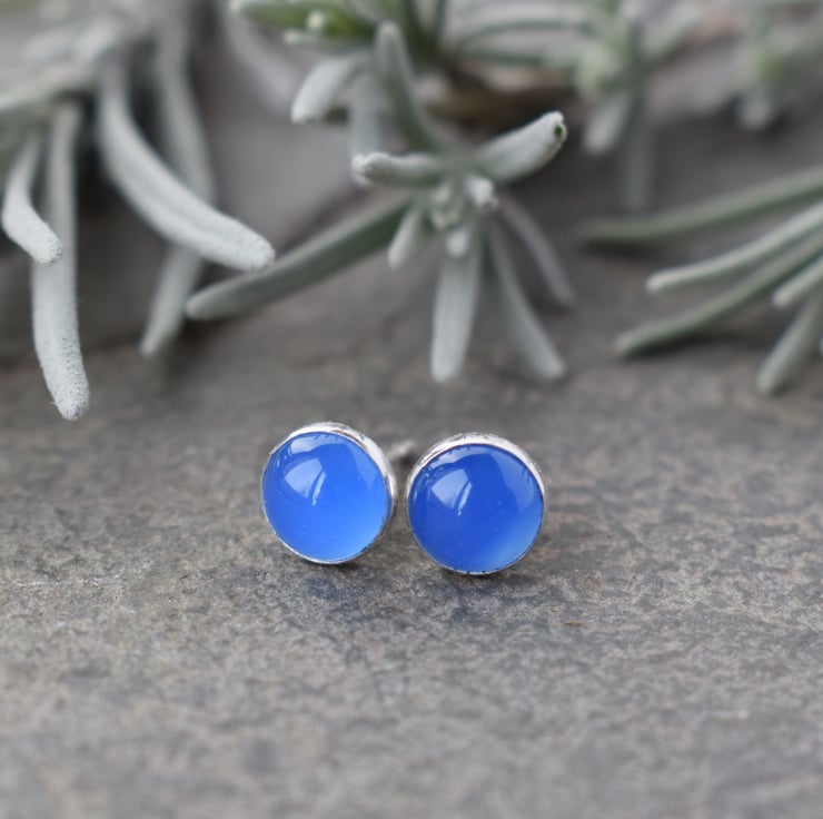 Blue onyx stone stud earrings handmade in a classic sterling silver round bezel setting. A simple, lightweight pair of earrings that are perfect for everyday.