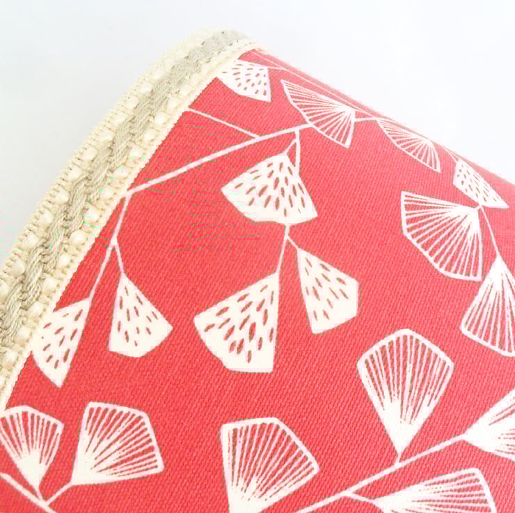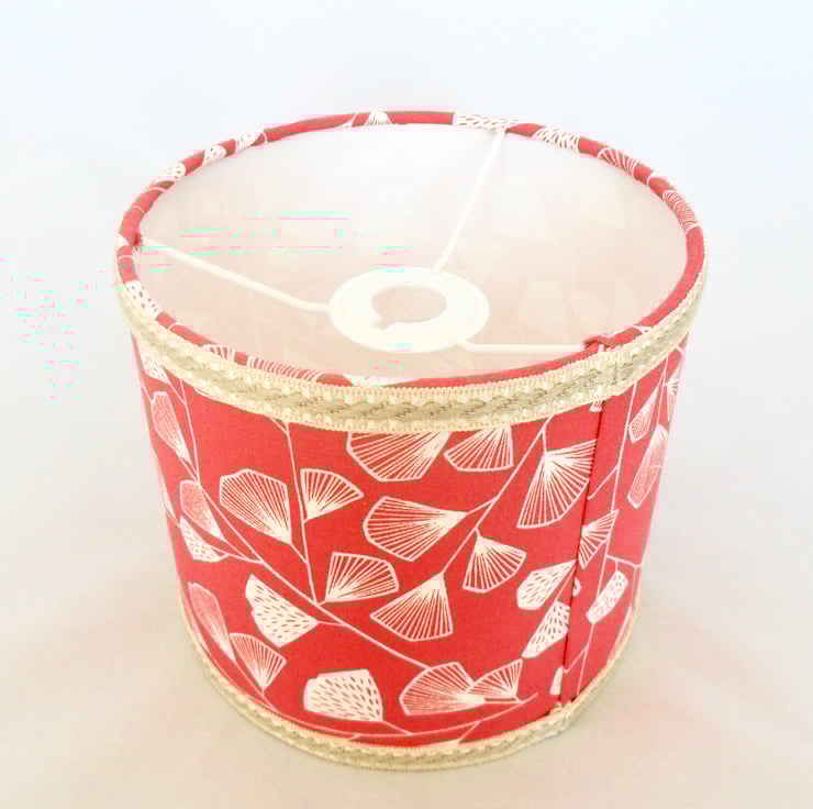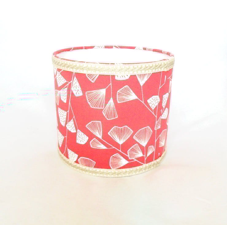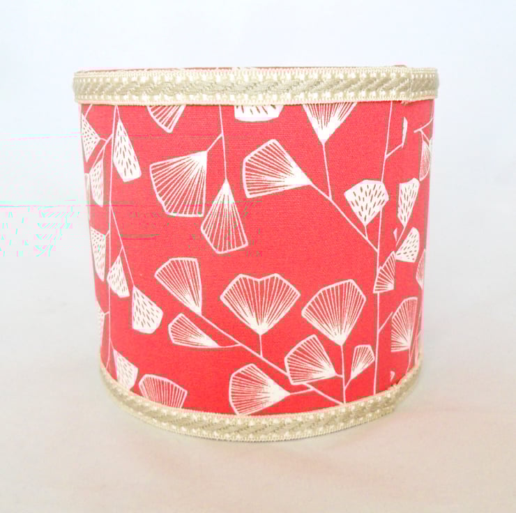 A lovely contemporary drum lampshade, handmade in a coral pink cotton print. A cream and beige gimp braid has been added to the top and bottom edges. The 20cm lampshade has rolled edges and a white PVC liner that has passed the relevant safety checks. Designed to be used with a table lamp, the 'anyway up' design of the fabric also allows for use as a pendant shade. The fitting has an adaptor for use in Europe.