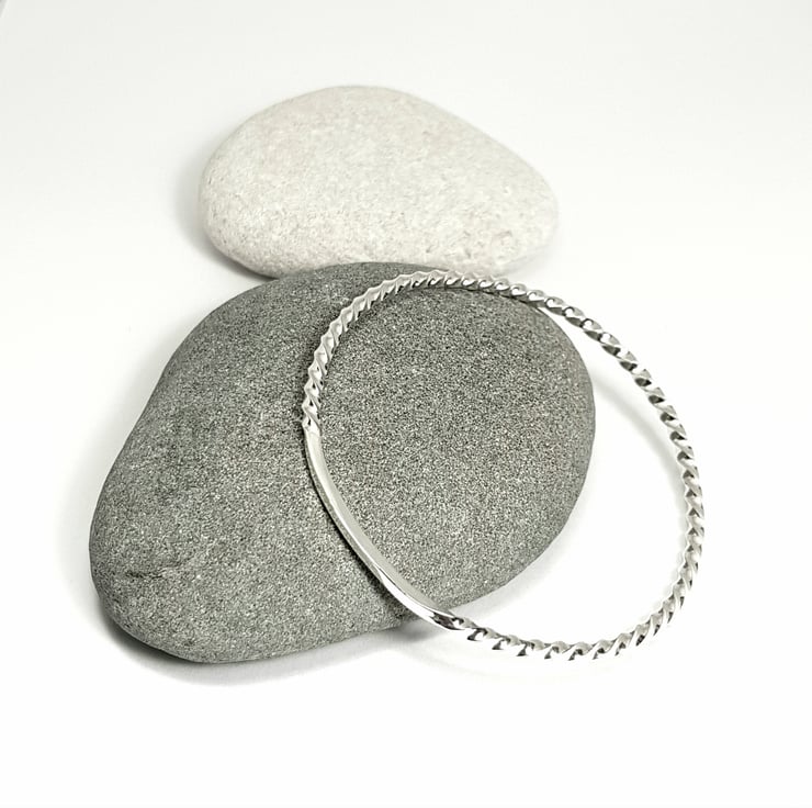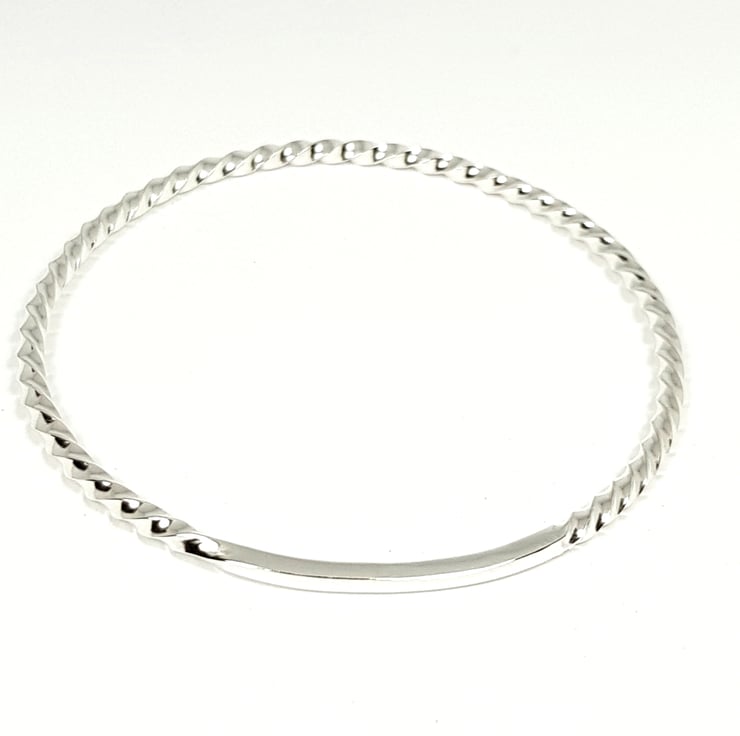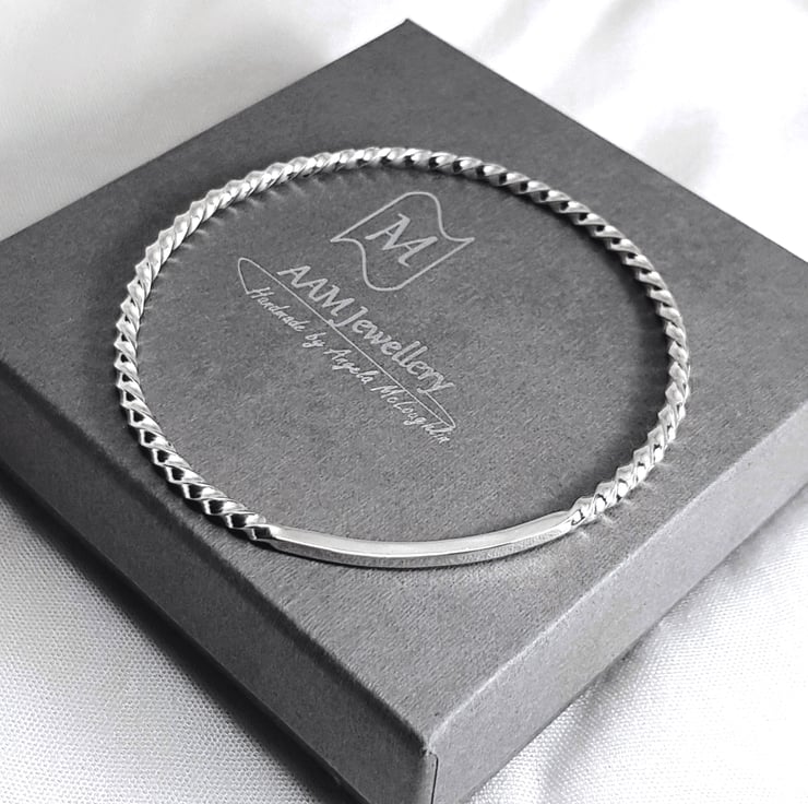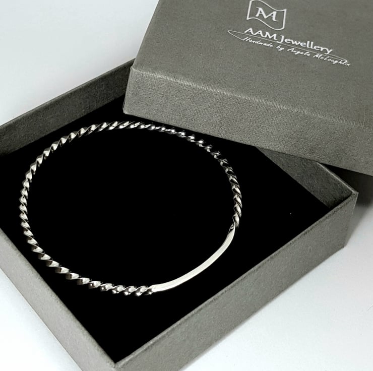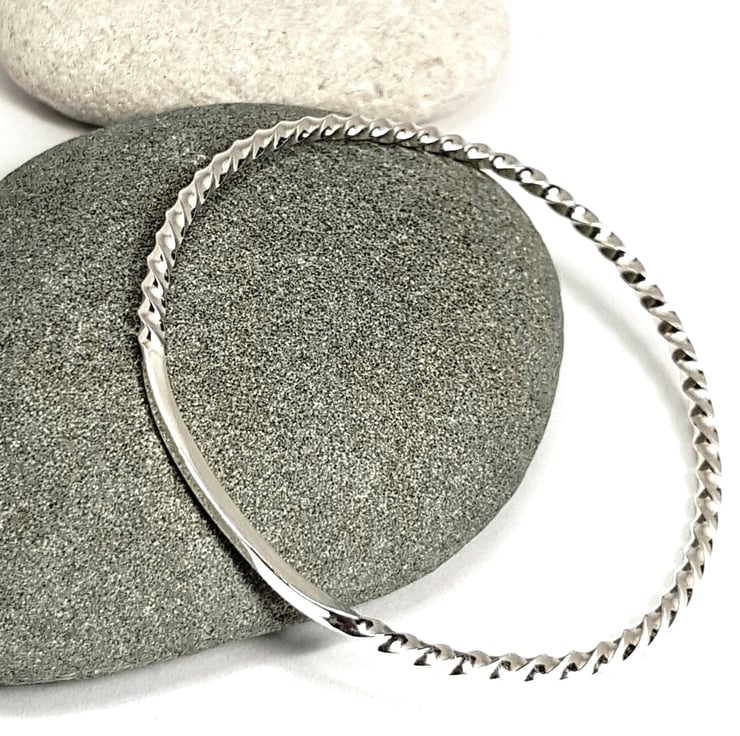 This is a cute little bangle and very versatile. The main section of the bangle is twisted but leaving a featured flat section for added interest. It looks great on it's own for a minimalist look or can be stacked with other pieces for a more boho feel.