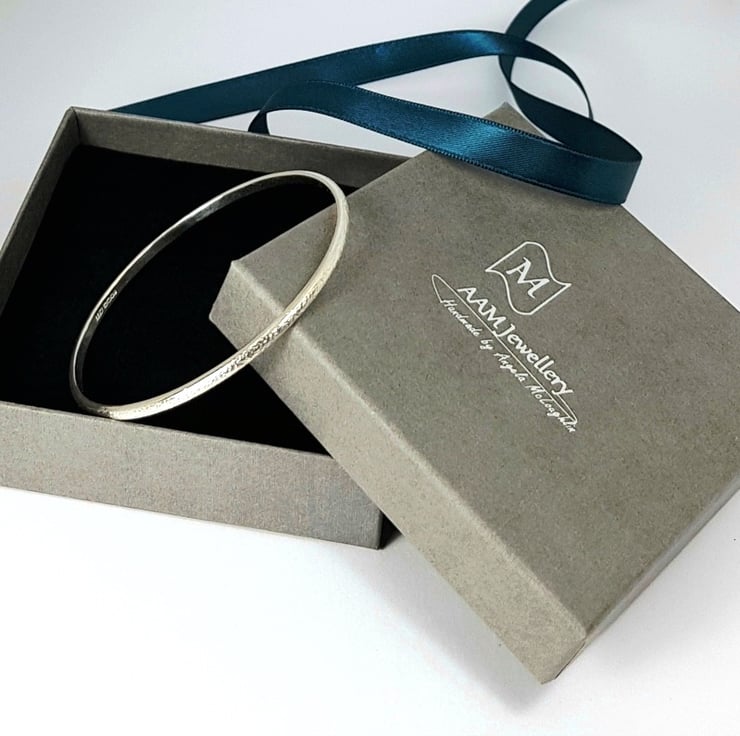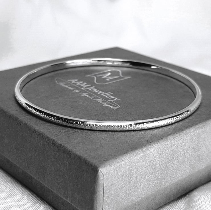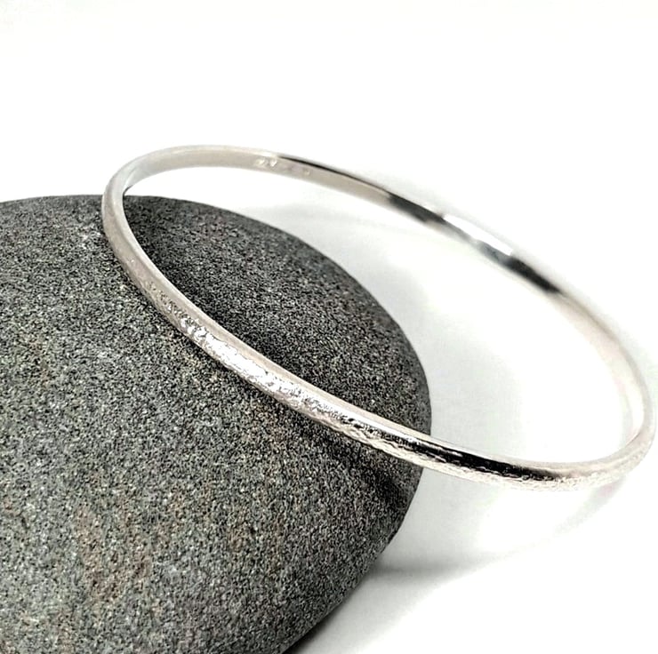 Classic, simple sterling silver bangle with a subtle surface texture and contrasting polished inside and edges. It looks great worn on its own for a minimalist look or can be stacked with other pieces for a more boho feel.