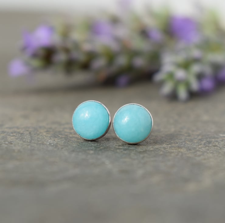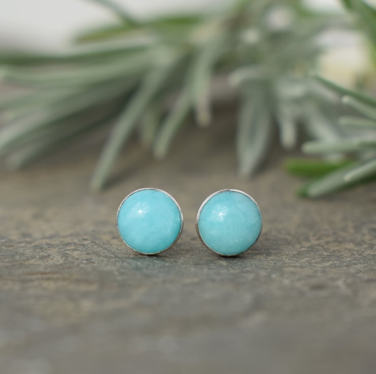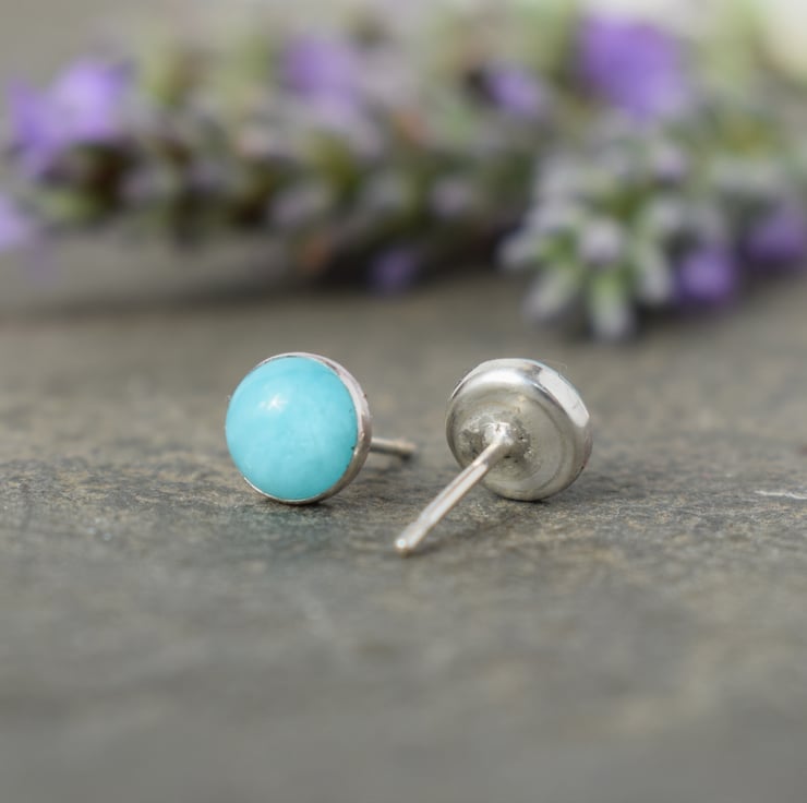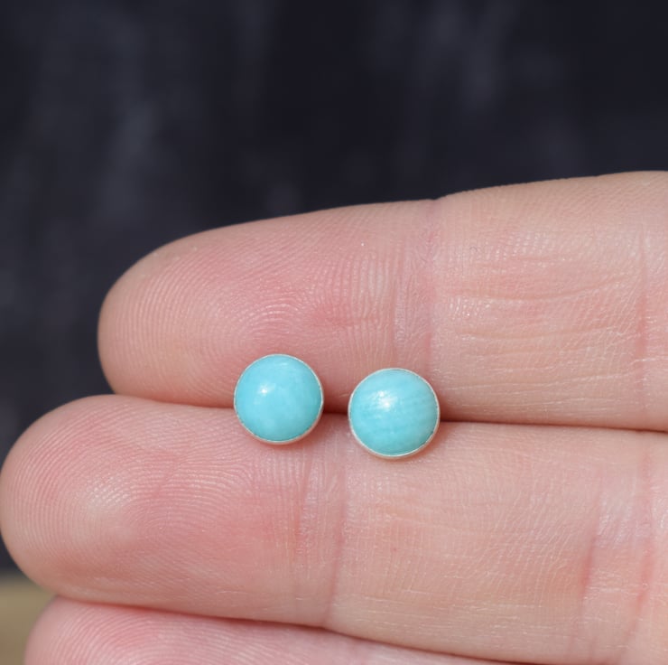Handcrafted sterling silver stud earrings with Peruvian Amazonite stones in a beautiful blue-green shade. The settings are soldered in my studio before setting each stone by hand. A simple, wearable pair of earrings that are perfect for everyday.