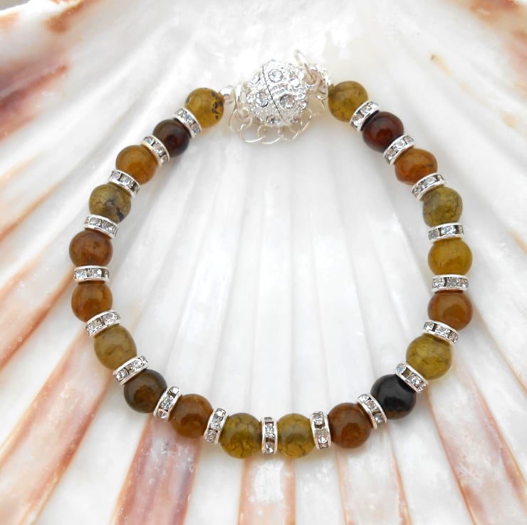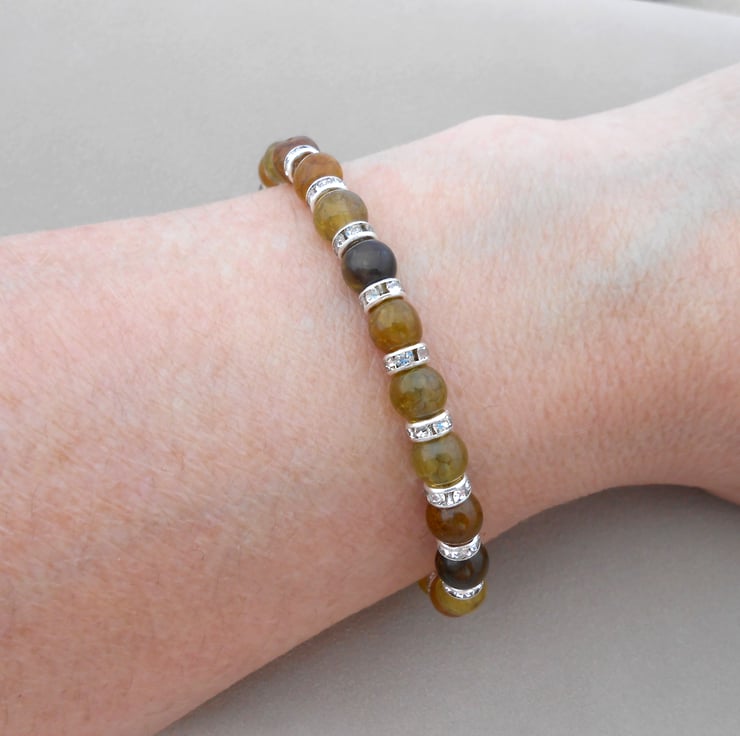 Beautiful green brown dragon agate silver plated bracelet for adults. It is 7" in length and fastens with a rhinestone magnetic clasp, which is perfect for anyone who struggles to fasten ordinary clasps. I have also added a safety chain for peace of mind. The dragon agate stones are 6mm rounds in stunning colours of brown, green and yellow. They are separated by rhinestone beads. It will be wrapped in blue tissue paper inside a matching organza bag. Only £9.50 plus FREE delivery to the UK 2nd class, delivery to the EU is just £3.00.