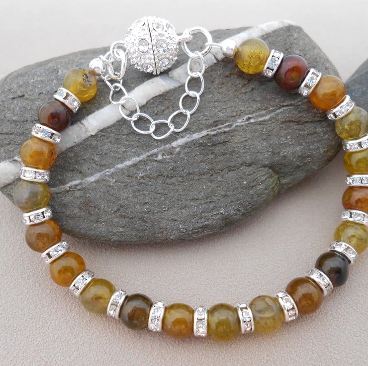 Beautiful green brown dragon agate silver plated bracelet for adults. It is 7" in length and fastens with a rhinestone magnetic clasp, which is perfect for anyone who struggles to fasten ordinary clasps. I have also added a safety chain for peace of mind. The dragon agate stones are 6mm rounds in stunning colours of brown, green and yellow. They are separated by rhinestone beads. It will be wrapped in blue tissue paper inside a matching organza bag. Only £9.50 plus FREE delivery to the UK 2nd class, delivery to the EU is just £3.00.