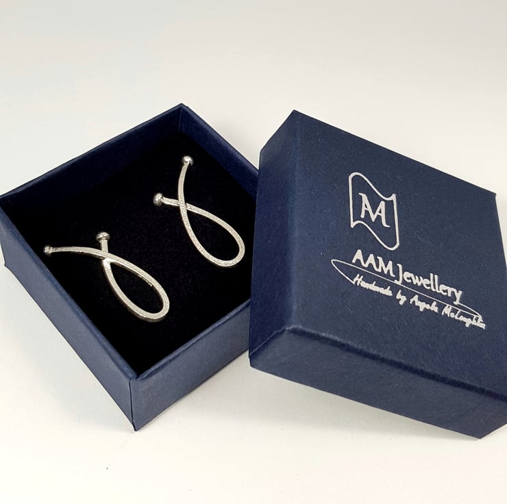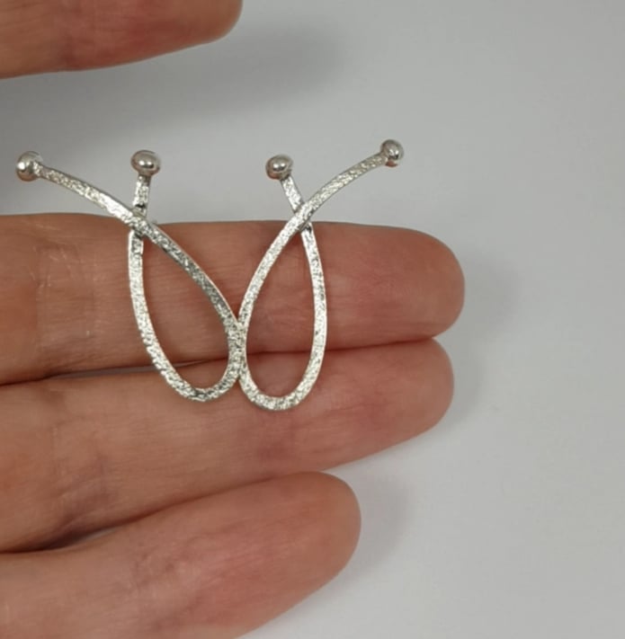Large sterling silver loop studs featuring a subtle textured front surface contrasting with the polished sides and back. The longer strand hugs the outer edge of the ear (creeper style) and the shorter one curves slightly towards the face. The cute little balls ends add a kind of whimsical touch!