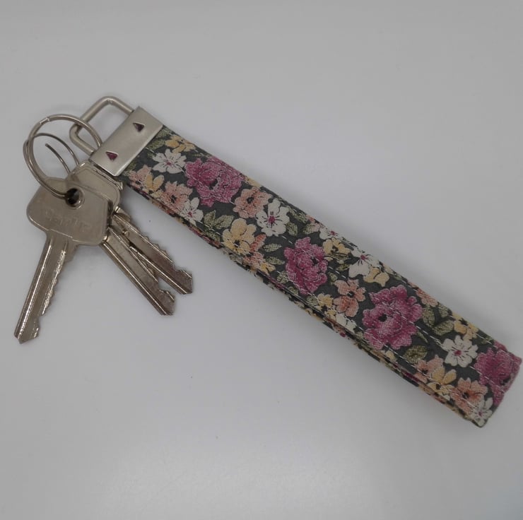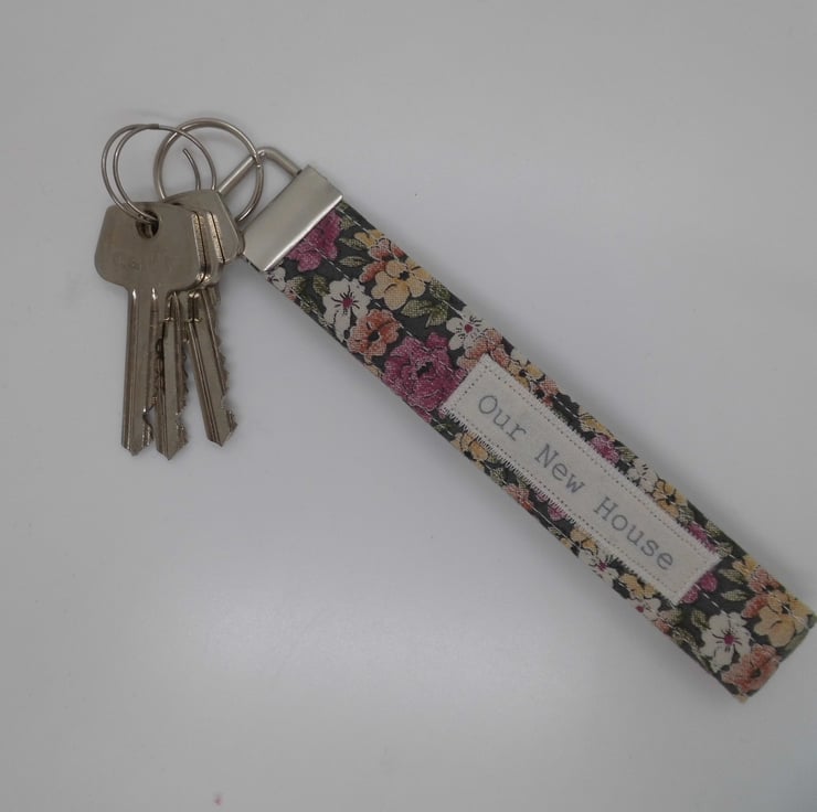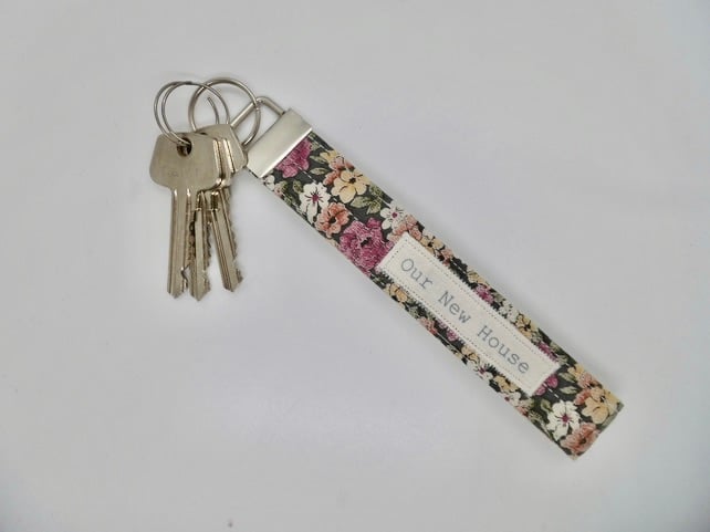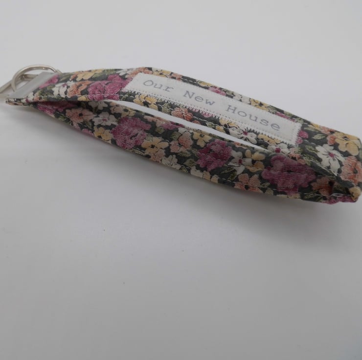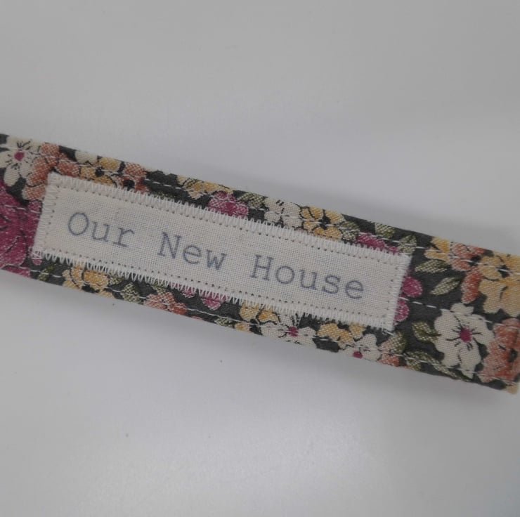 This wrist strap key ring is made with a pretty pink floral printed cotton fabric, to which I added a layer of felt for padding. I printed "Our New House" in grey onto cream cotton fabric and appliquéd it onto the strap. Top stitched along the edges and down the middle.