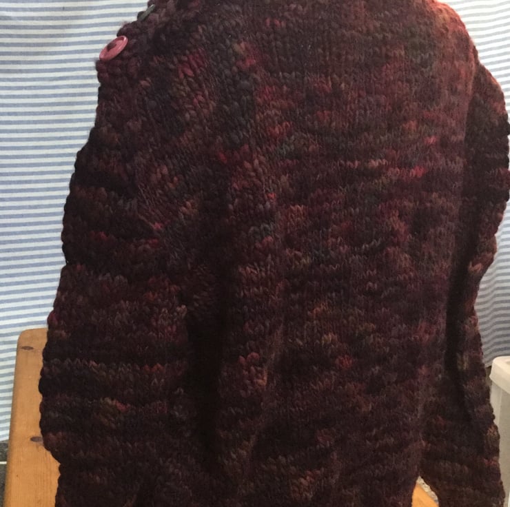 Mobair midi 100% wool slub random hand dyed yarn. Hand knitted by Victoria with button fastenings on shoulder.