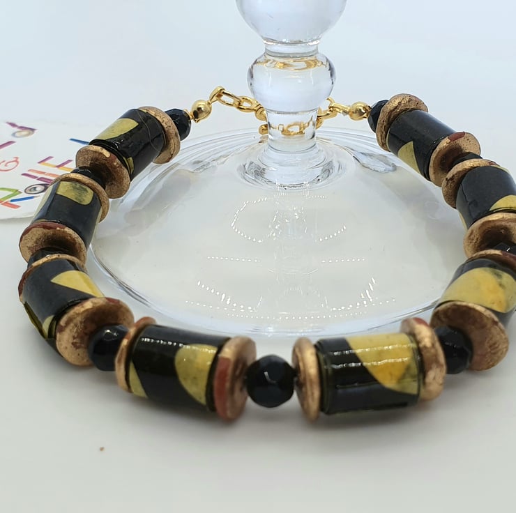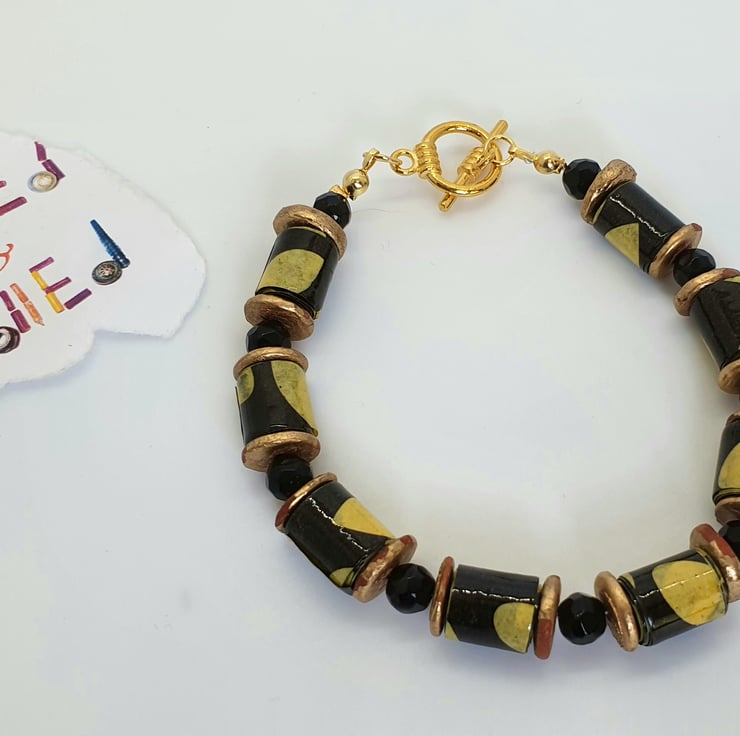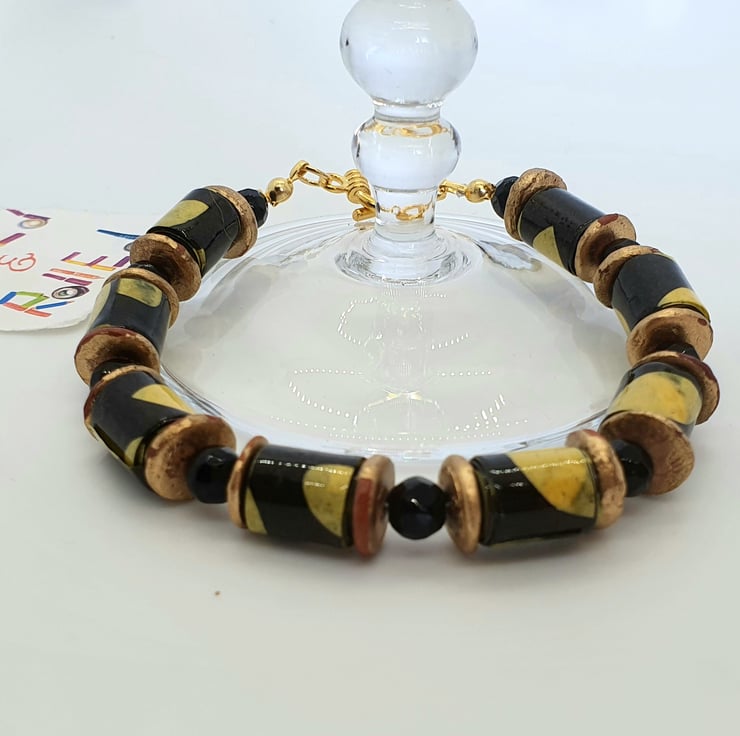 A lovely bracelet made out of paper beads, inspired by African ethnic designs. The black and yellow paper beads are made of recycled flower wrapping paper which was cut into strips, hand rolled and then varnished. Shiny black glass preloved beads are used as spacers; as are distressed bronze discs with underlying brick red hues.