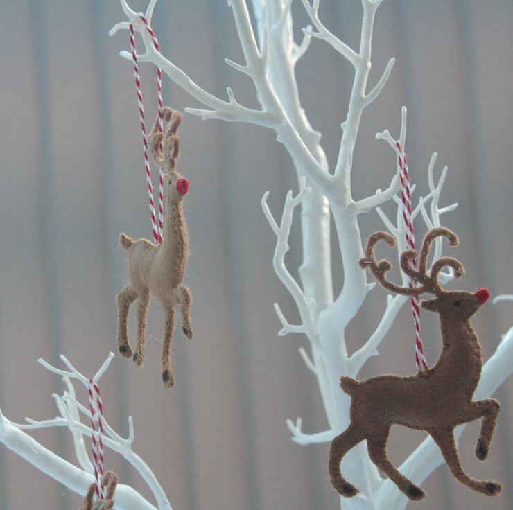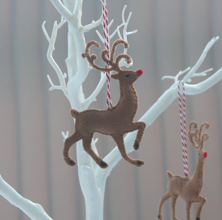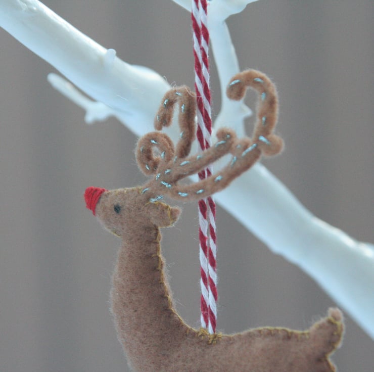 These Reindeers are cut from beige coloured wool blend felt. Their antlers have embroidered using silver embroidery thread to add a touch of sparkle and black cotton thread is used to give them eyes. The Reindeer are lightly stuffed with toy stuffing to give them a bit of shape and are hand sewn together using a blanket stitch all the way around the edge. Finally, red embroidery thread has been used to add their shiny red noses. The hanging loop is sewn in with the blanket stitch to ensure this is secure. They can be hung anywhere with their red and white twine hanging loop, which is extended to allow them to hang nice and square. The reindeer is approximately 17cm tall and the hanging loop is approximately 12cm long, this extends approximately 5cm from the top of the antlers.