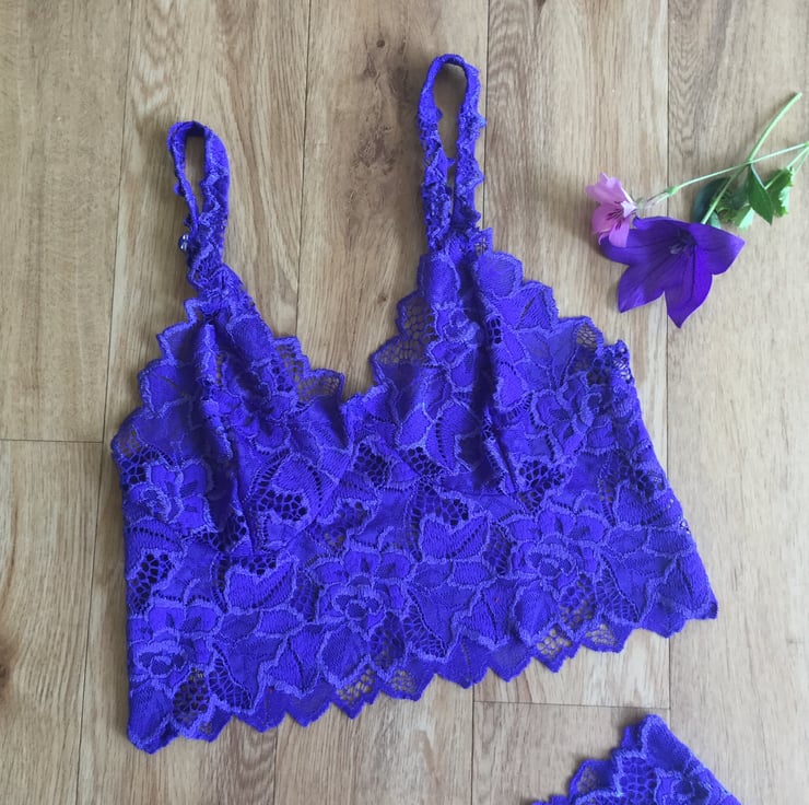 The bralette is a classic cupped style with a wide underband and adjustable lace straps.