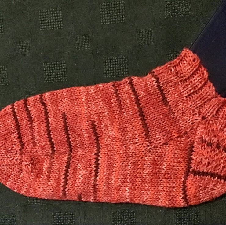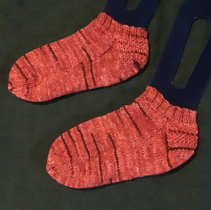 Hand knit socks. Red denim marl. Short no show length. Trainer socks. 75% wool, 25% nylon. Size uk ladies 5 to 6. Hand made in Lancashire uk from wool. Not machine knit.