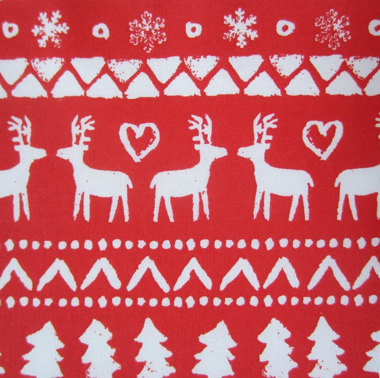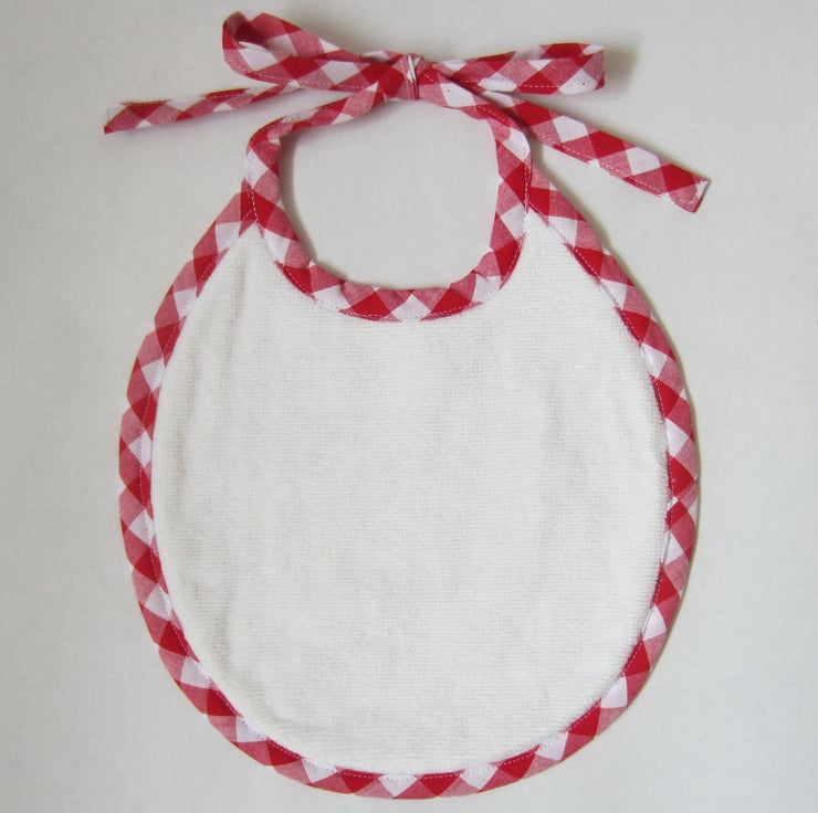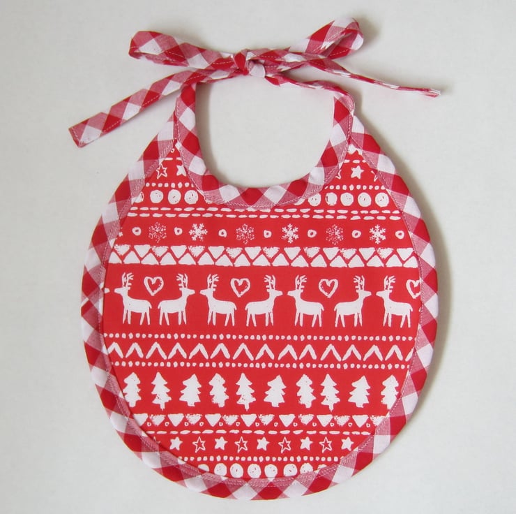 First size baby bib in a red and white Scandi style stag, tree, star and snowflake Christmas fabric.. It is edged in a red and white gingham bias binding and backed with white soft velour towelling for extra protection.