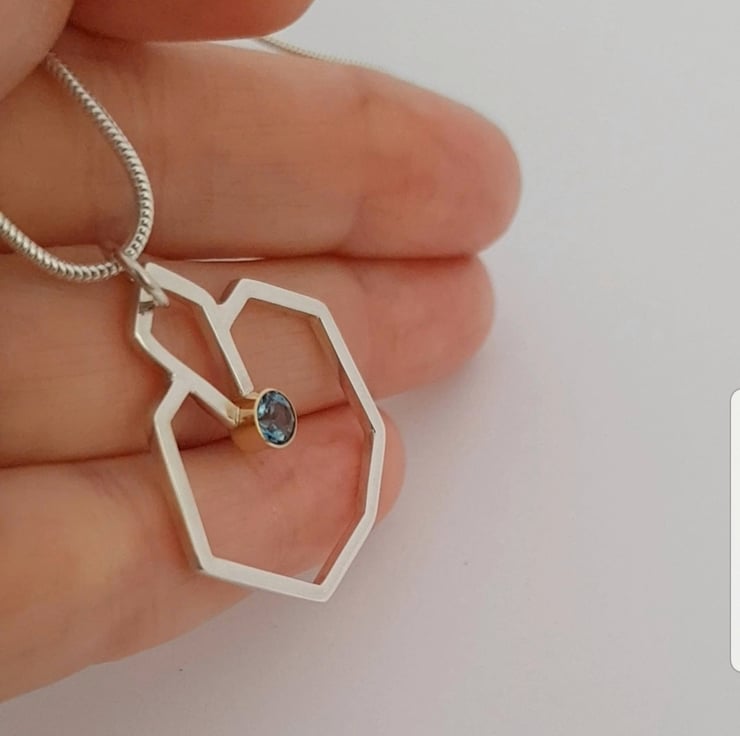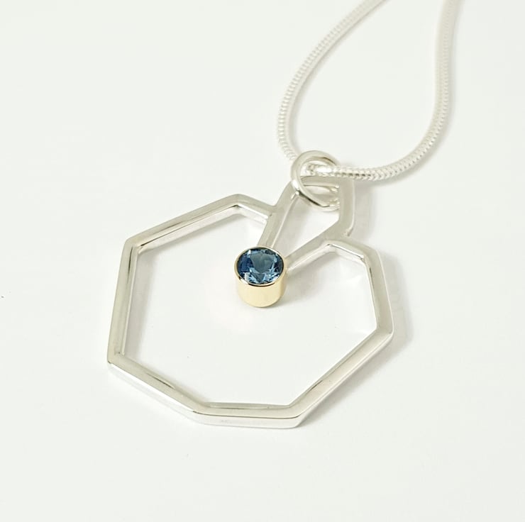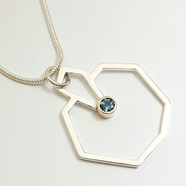 The asymmetrical shapes that make up this necklace come together to compliment and complete the design and the beautiful dark aquamarine adds a luxurious splash of colour.
