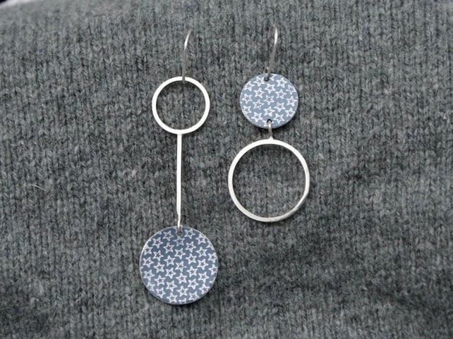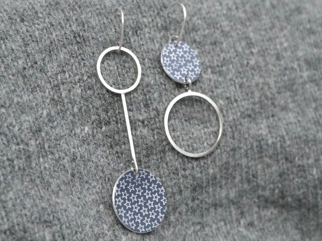 A quirky pair of statement earrings made from sterling silver and anodised aluminium. The silver parts are made from square silver wire and the aluminium circles feature a delicate star print. I make the print digitally before applying it to the metal as a resist. This is then dyed and sealed and then the resist is removed leaving the pattern. The pieces are then finished using traditional metalworking techniques. The ear wires are hand made from sterling silver.