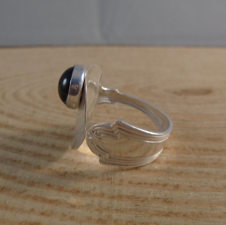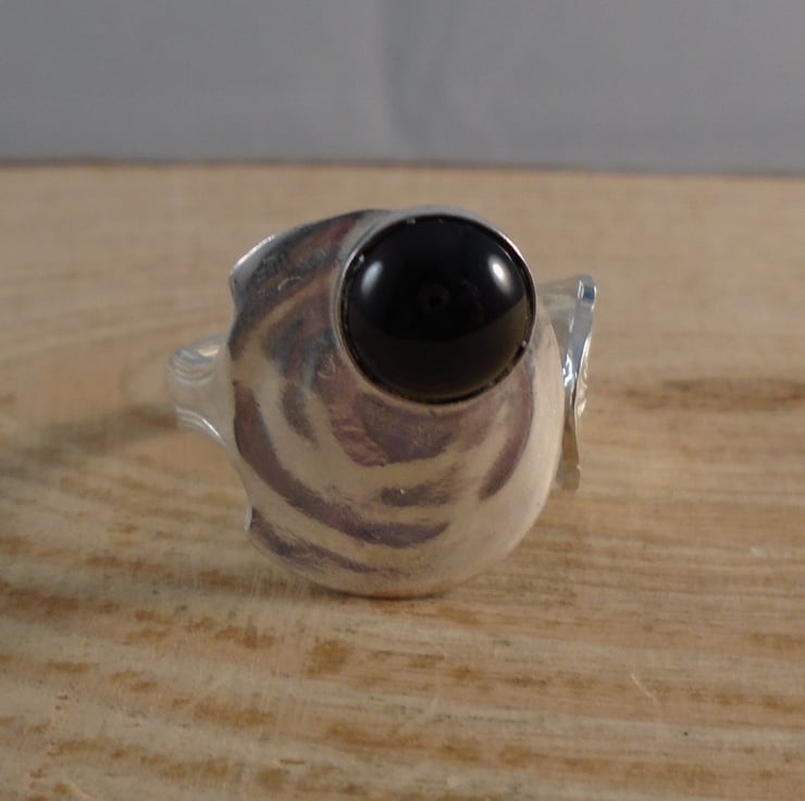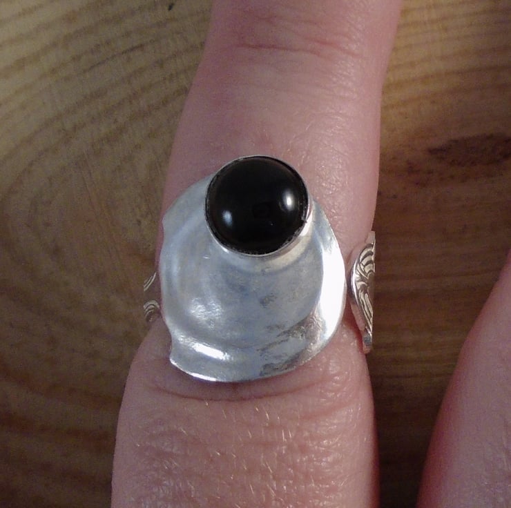 An unusual and delicate ring, hand made from an old sterling silver mustard spoon. The bowl of the spoon has been flattened, and then the spoon has been bent around the mandrel to form the ring. An 8mm Onyx cabochon has then been set on the flattened bowl of the spoon ring.