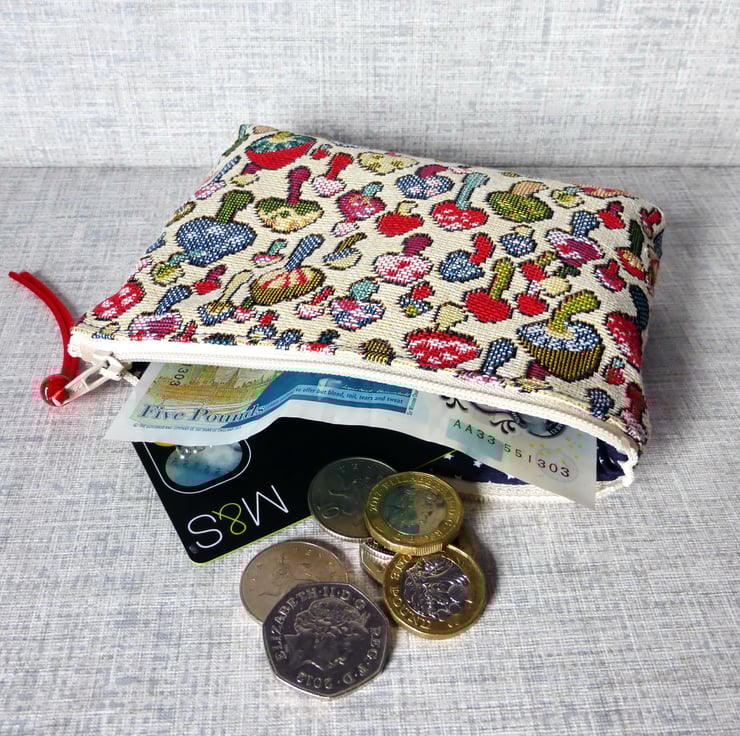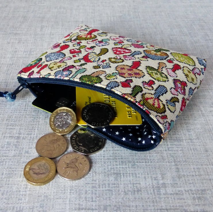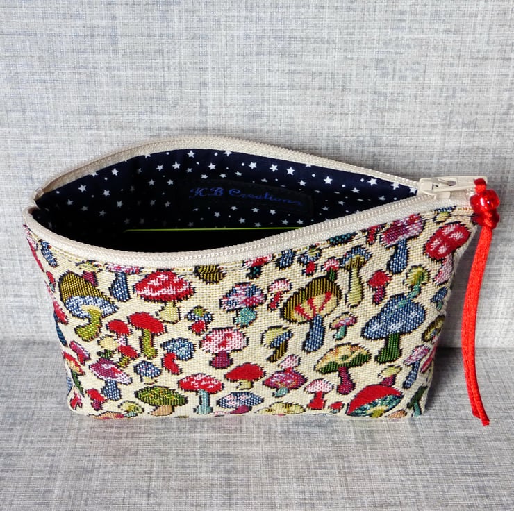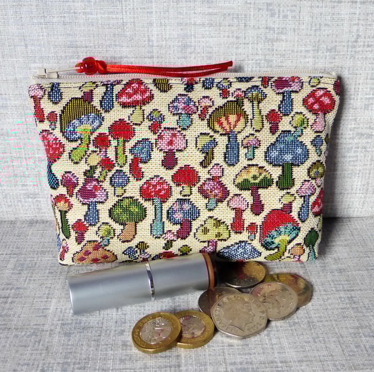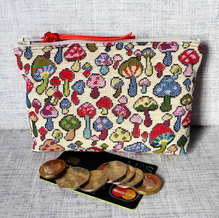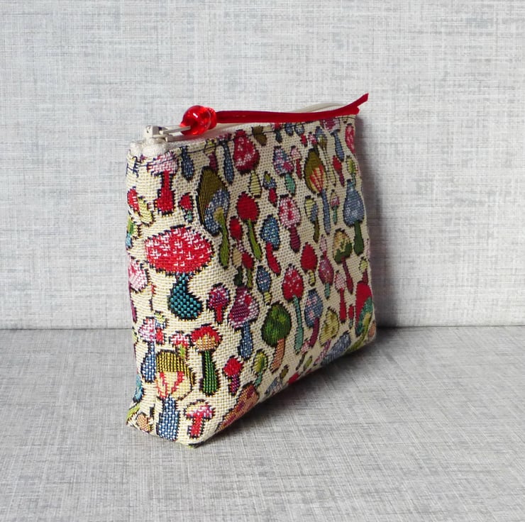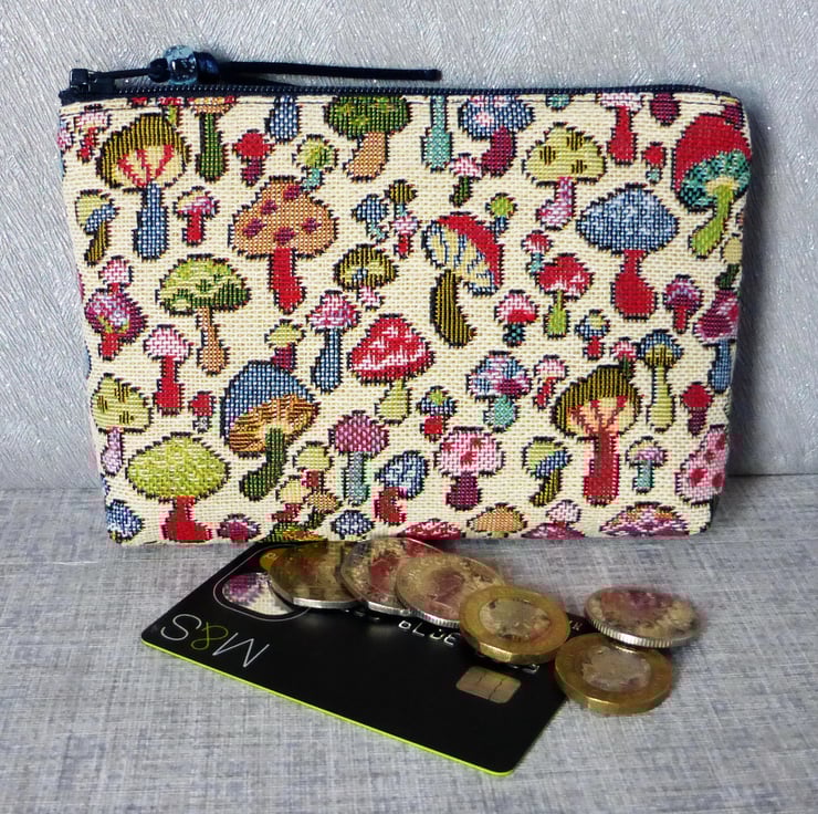 A large coin purse made from a tapestry canvas fabric with a mushrooms design in variuos different colours, on a cream patterned background.