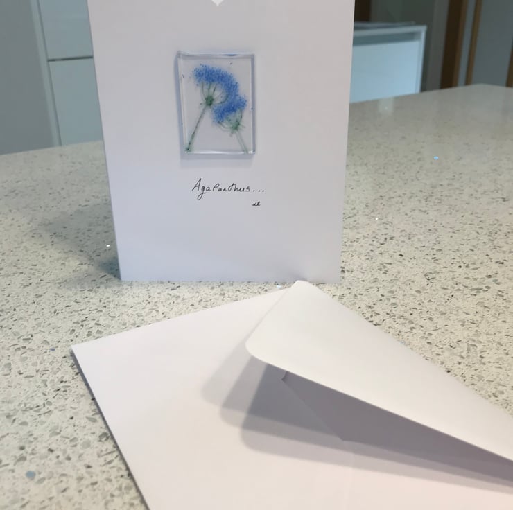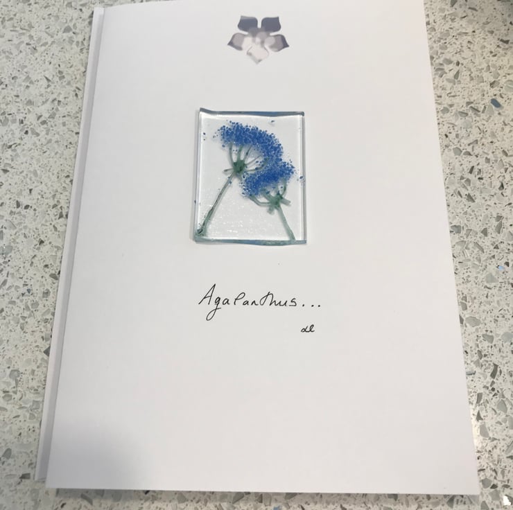 Agapanthus design delicate fused glass flower which once used as a card can re re purposed in a little box frame . Perfect card and a gift in one