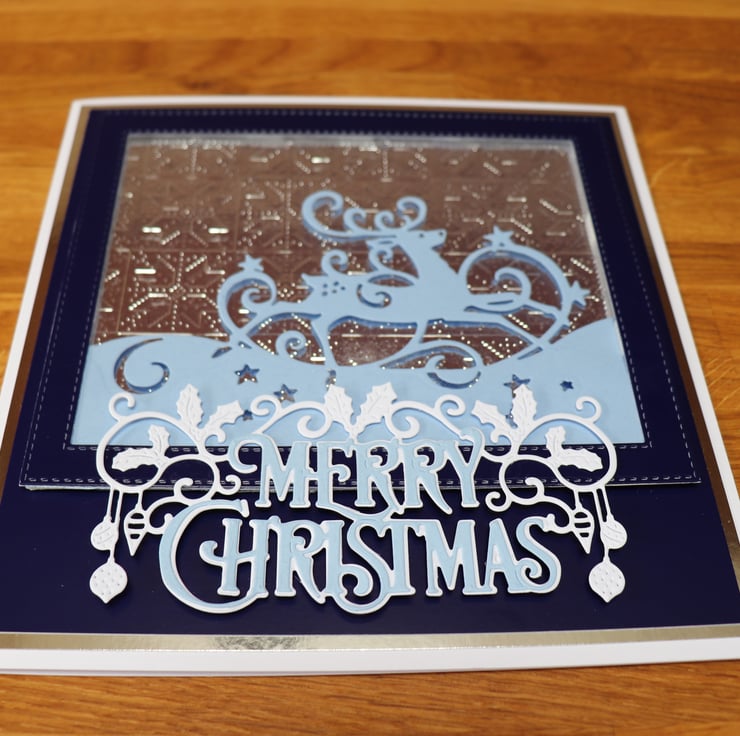 The reindeer is cut from periwinkle colour card and I have back him on a silver embossed Nordic back ground design, this I have framed in dark blue card and added the sentiment Merry Christmas.
