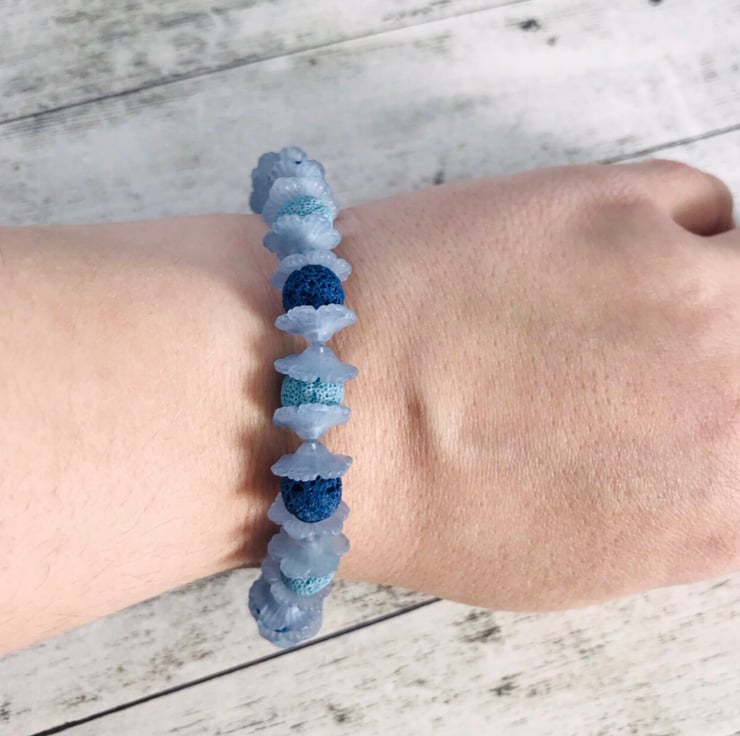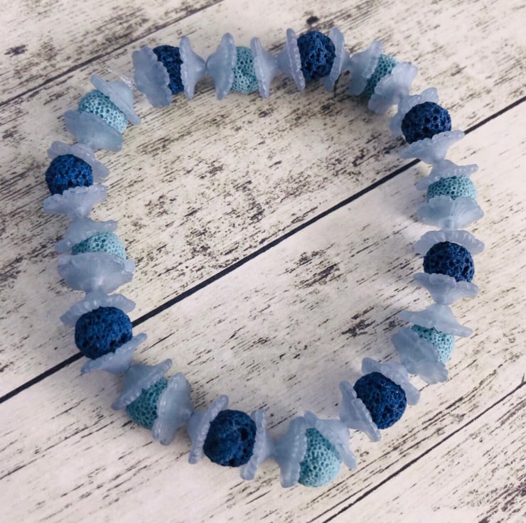 Blue lucite flower & lava beaded elasticated bracelet. Light & blue alternate beads encased inside two lucite flower heads. Model in picture has a 16cms wrist measurement, but can be worn up to 23cms comfortably.