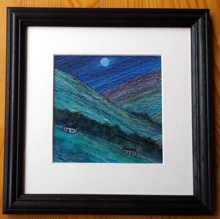 An imaginative wee nightscape painting in an antique white mount and dark green stained wood frame.