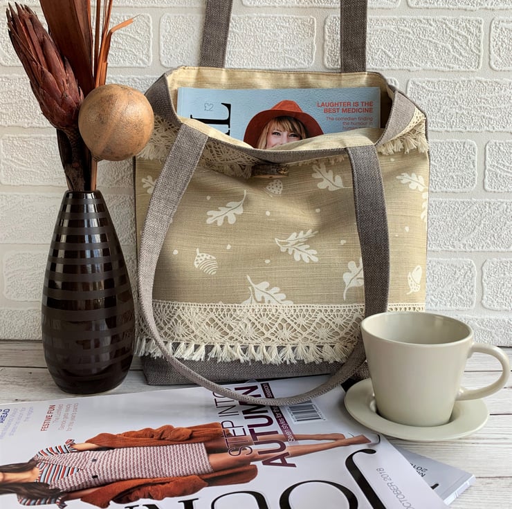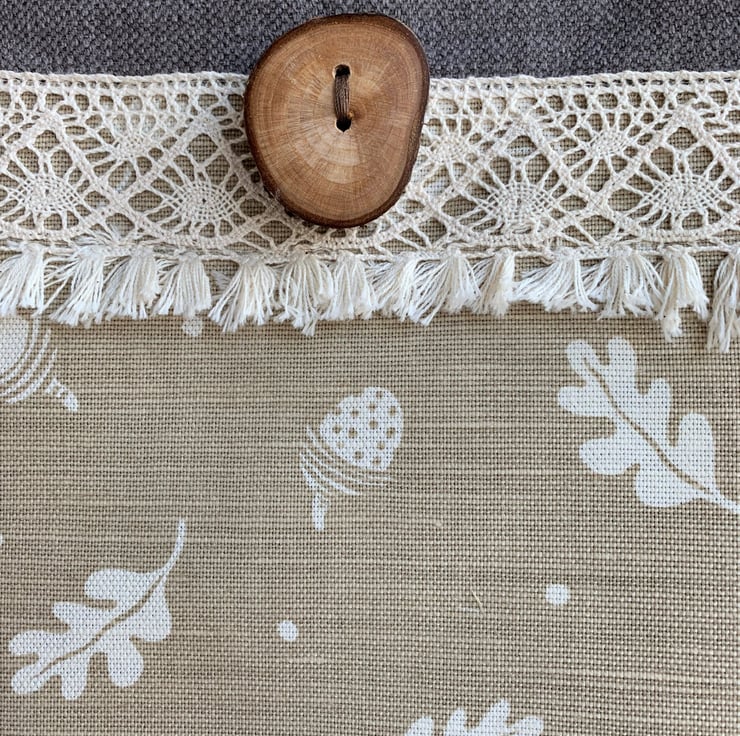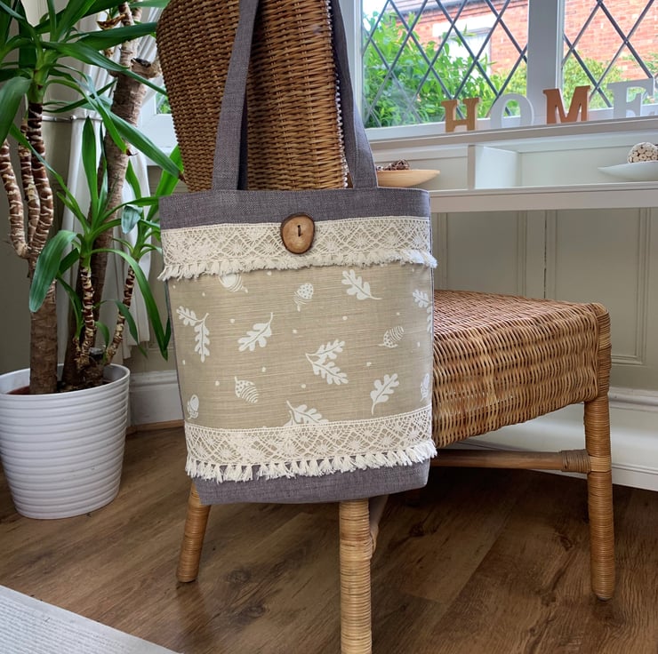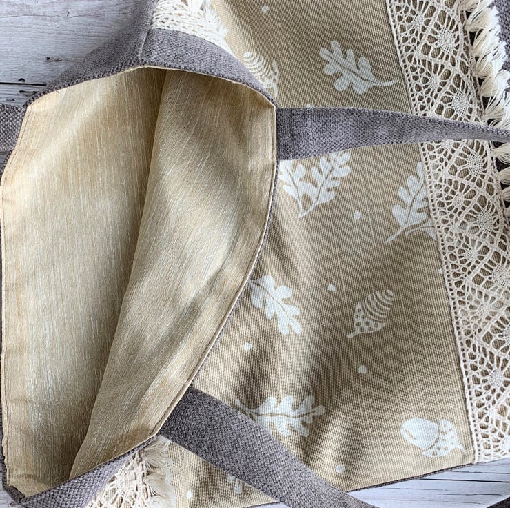A woodland themed tote bag in a sturdy taupe fabric with a front decorative panel. The panel features a delightful print pattern of white acorns and oak leaves on a beige background. The top and bottom edges of the panel are finished with a wide cream cotton lace trim with a tasselled lower edge, giving the bag a boho style. At the top of the bag I've enhanced the woodland theme by adding a gorgeous large handmade wooden button which still has the bark around the edge. (The button was purchased from Twisted Turner on Folksy). The bag is fully lined with warm creamy beige fabric with a slight sheen and faint stripes.
