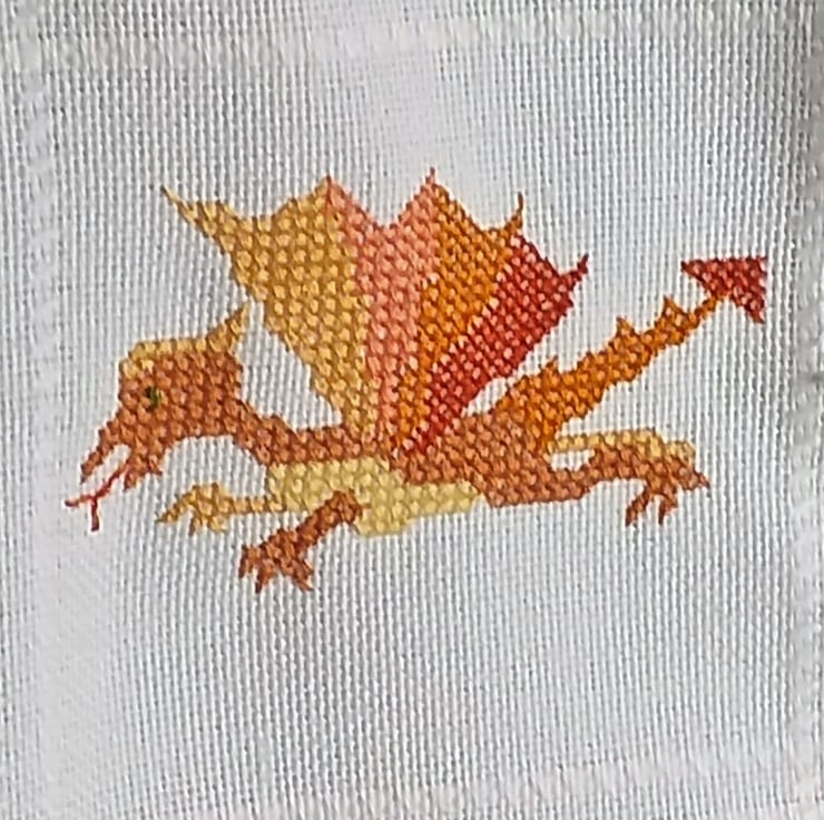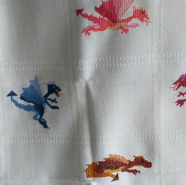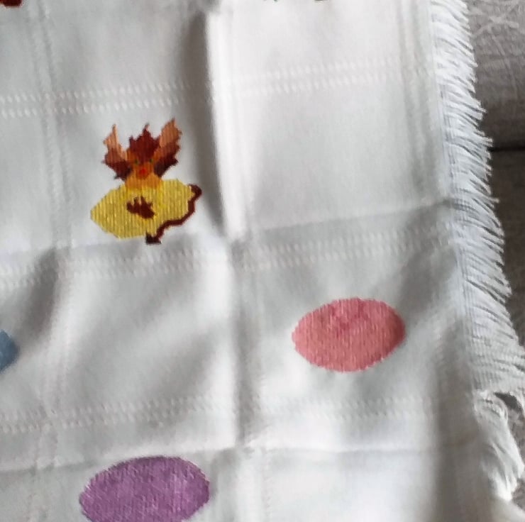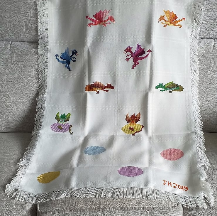 I'm very proud of this hand embroidered, soft acrylic, pale cream shawl. I have designed and stitched dragons in alternate squares, from perfect eggs to young hatchlings learning to walk and fly. The eggs are stitched using sparkly threads and the dragons vary in colour, from browns and greens through blues, pinks and purples. The shawl can be used as a cot blanket or even a wall-hanging. It is 24" (60 cm.) by 38" (96cm.) approximately within the fringe and can be hand washed in cool water.