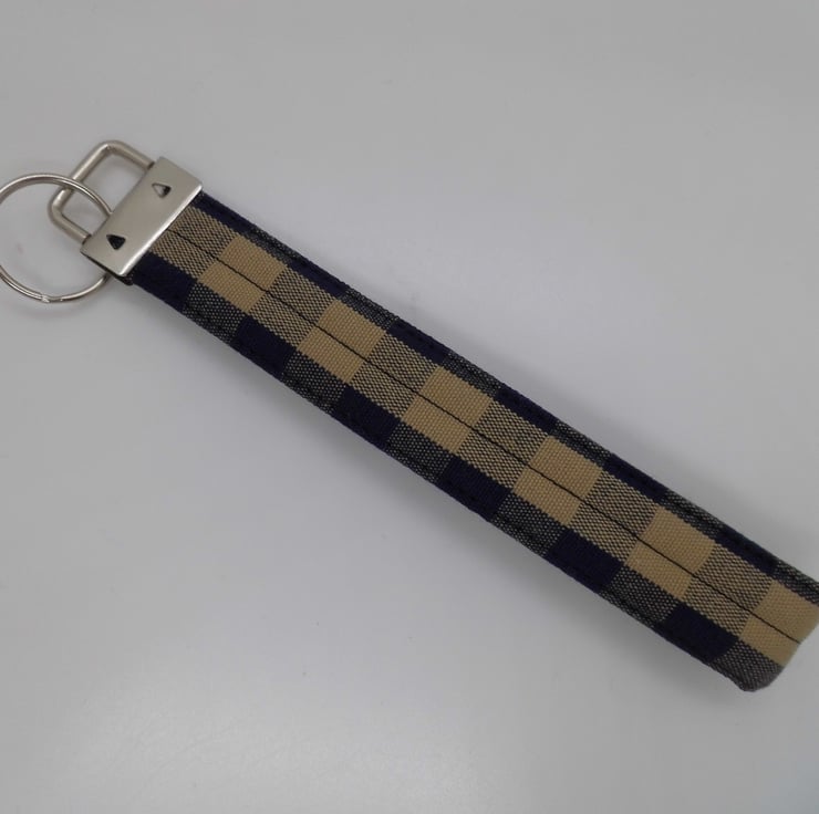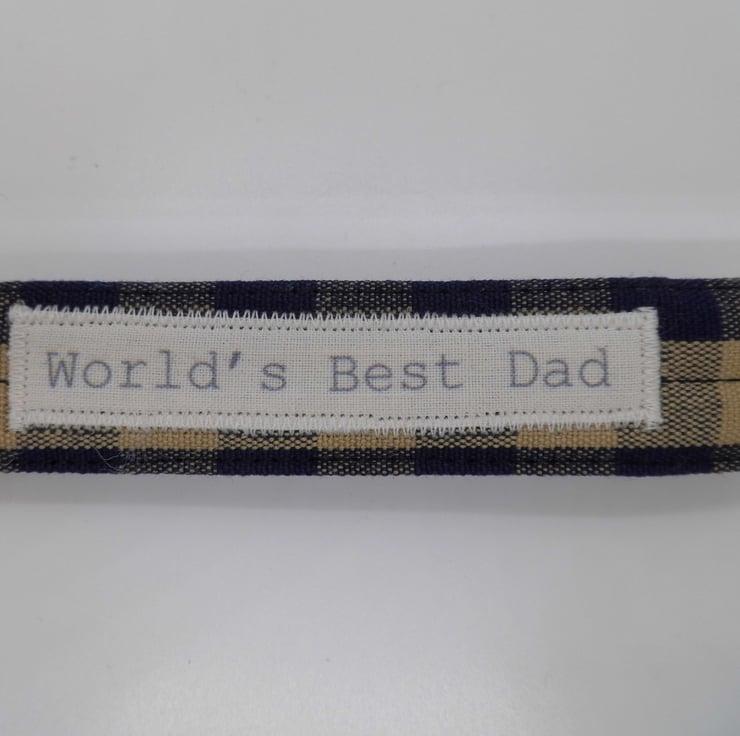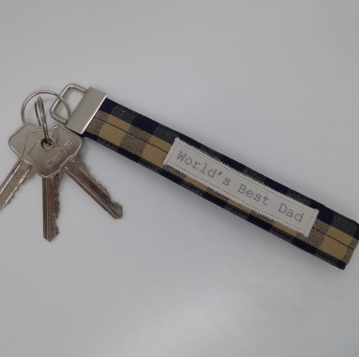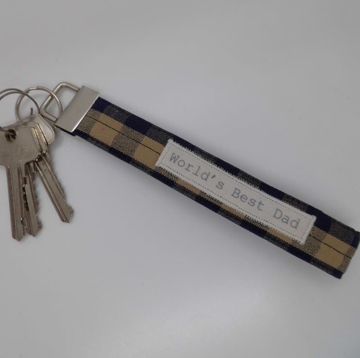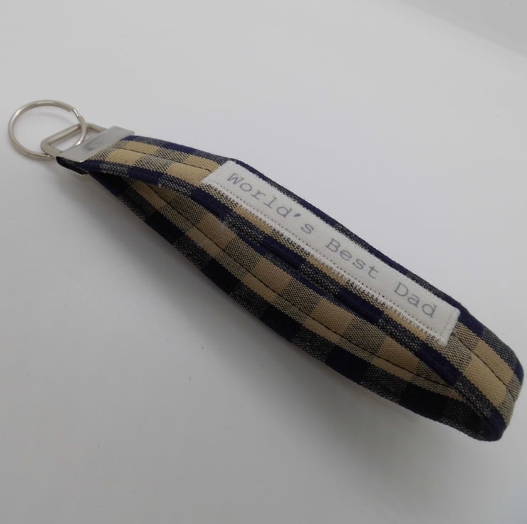 This wrist strap key ring is made with a navy blue and beige woven check cotton, to which I added a layer of felt to give it extra body and strength. I printed "World's Best Dad" in grey onto cream cotton fabric and appliquéd it onto the strap. Top stitched.