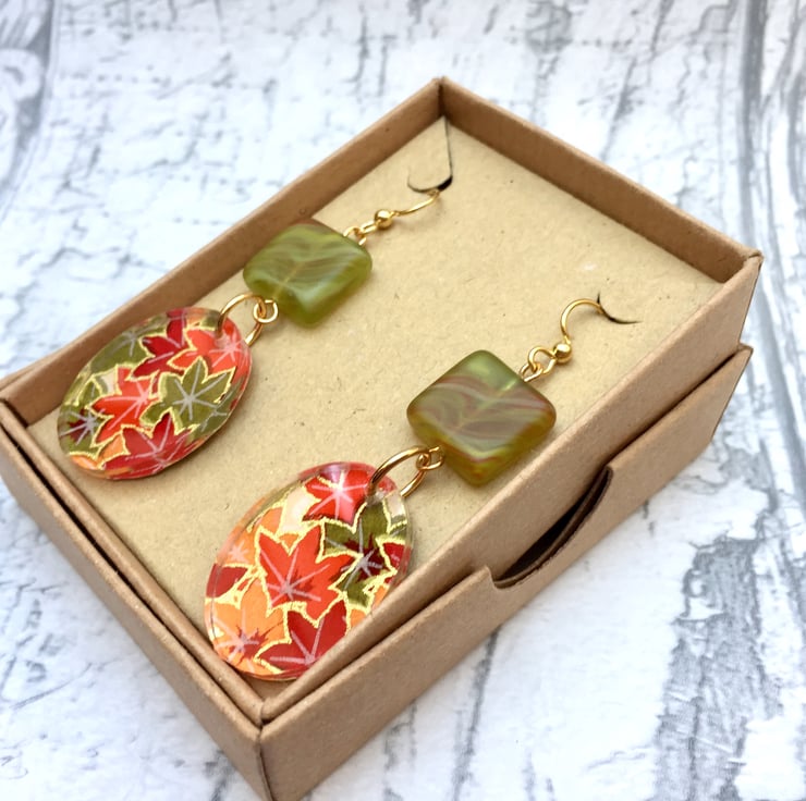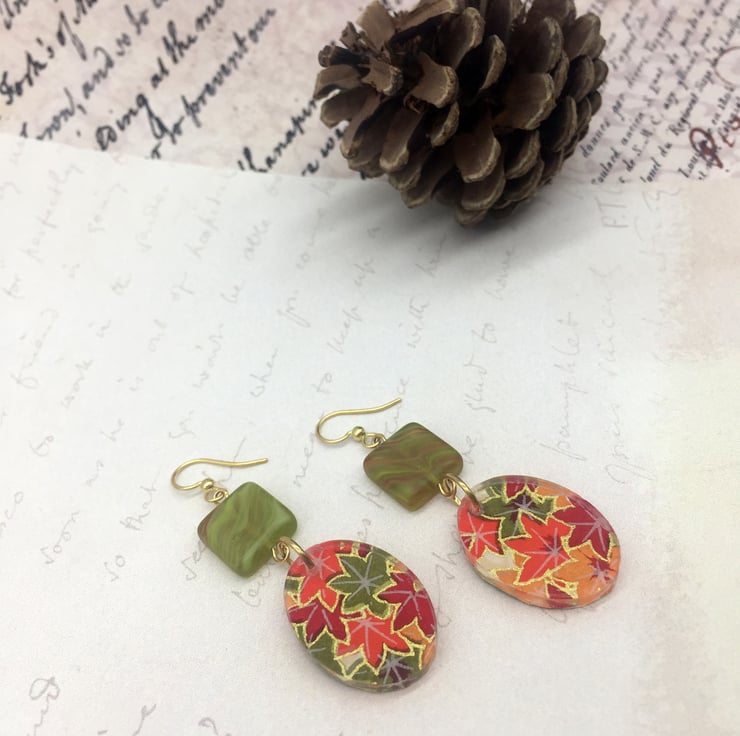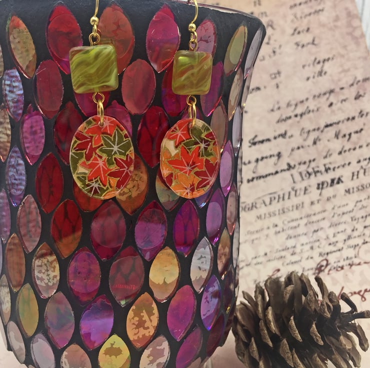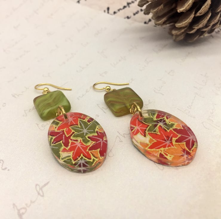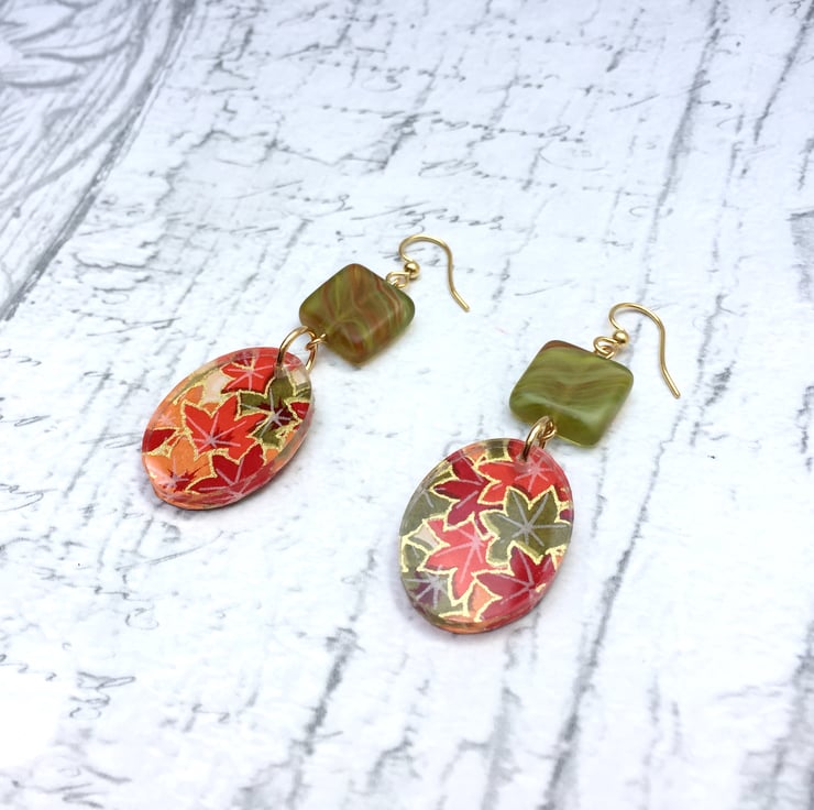 Beautiful Japanese Chyogami paper is the star of these handmade earrings (sometimes called Washi Paper). Each colour is added by hand, layer on layer - this particular paper has a lovely Autumnal feel to it - Japanese Acer it maple leaves in a myriad of Fall colours like red, orange, yellow and green with gold metallic line art.