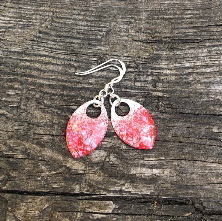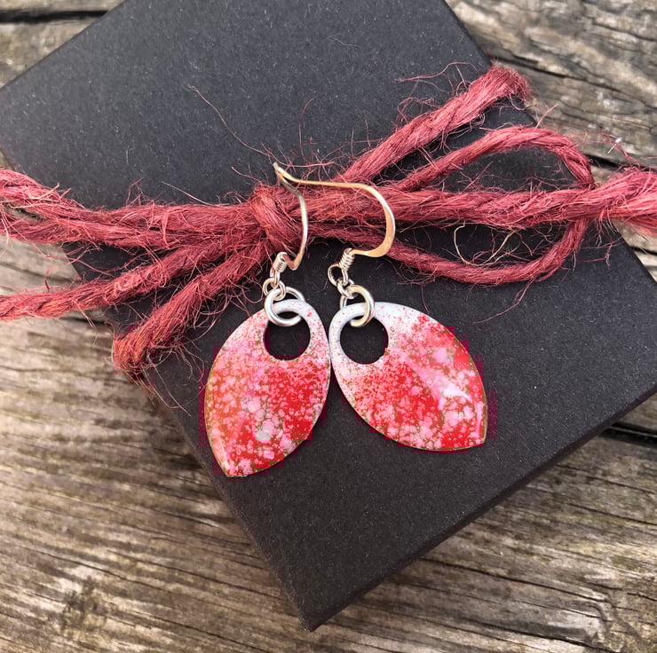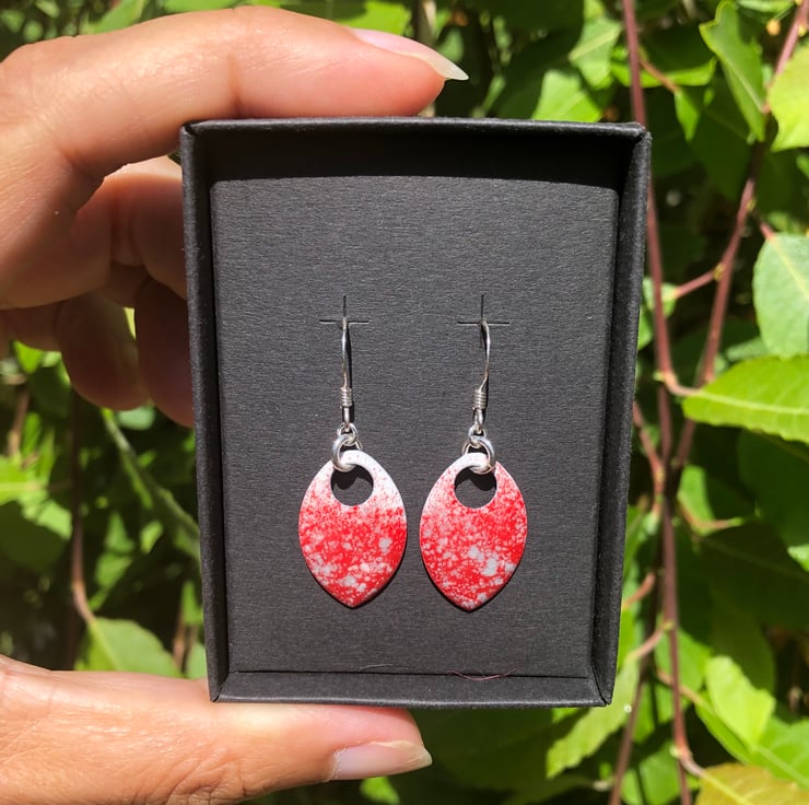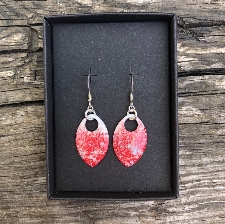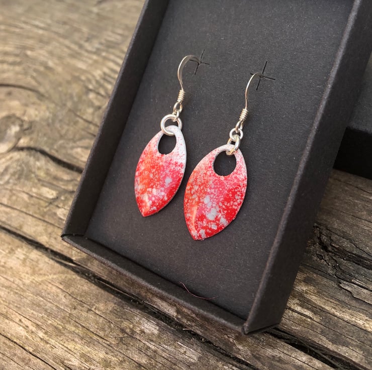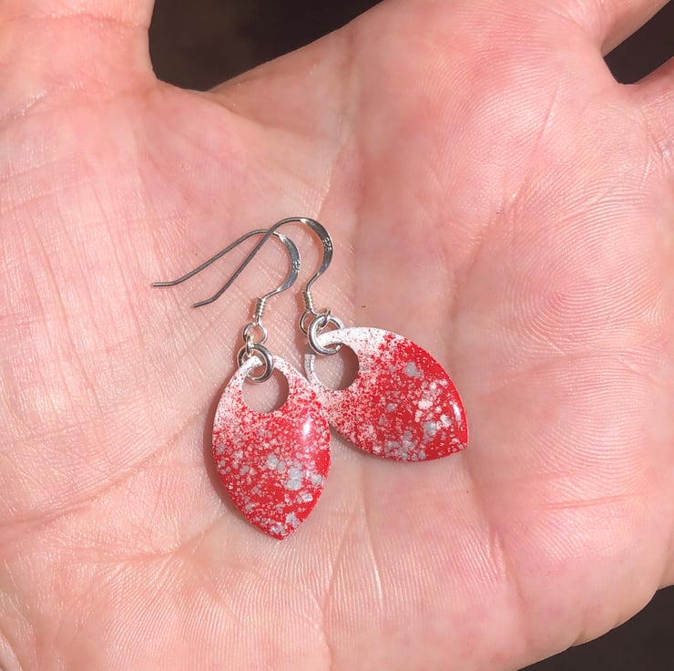 Super light weight aluminium scales have been hand enamelled in a number of layers of cold enamel. These hang from sterling silver fish hook earrings using sterling silver jump rings. The back of the scale remains blank, silver in colour.