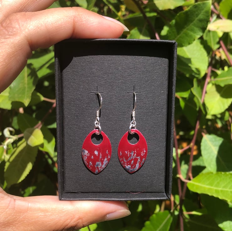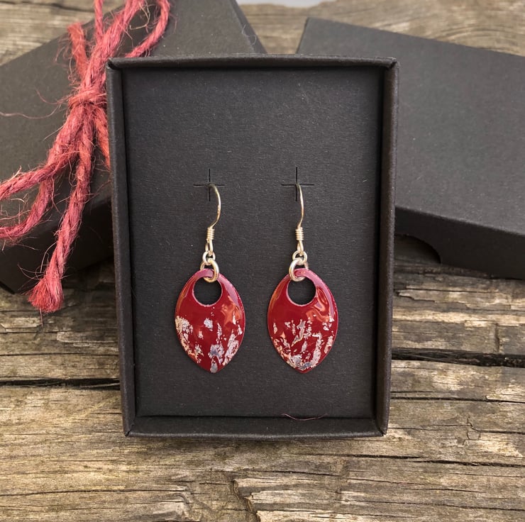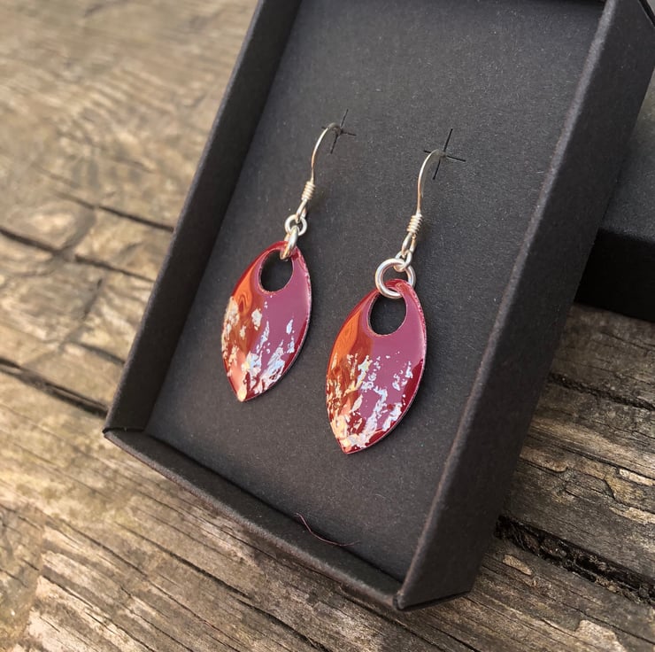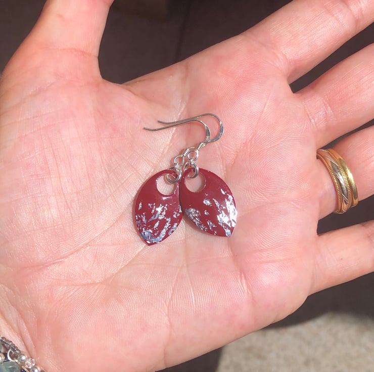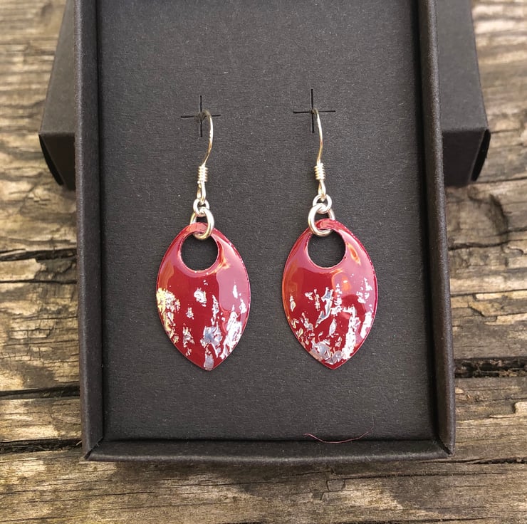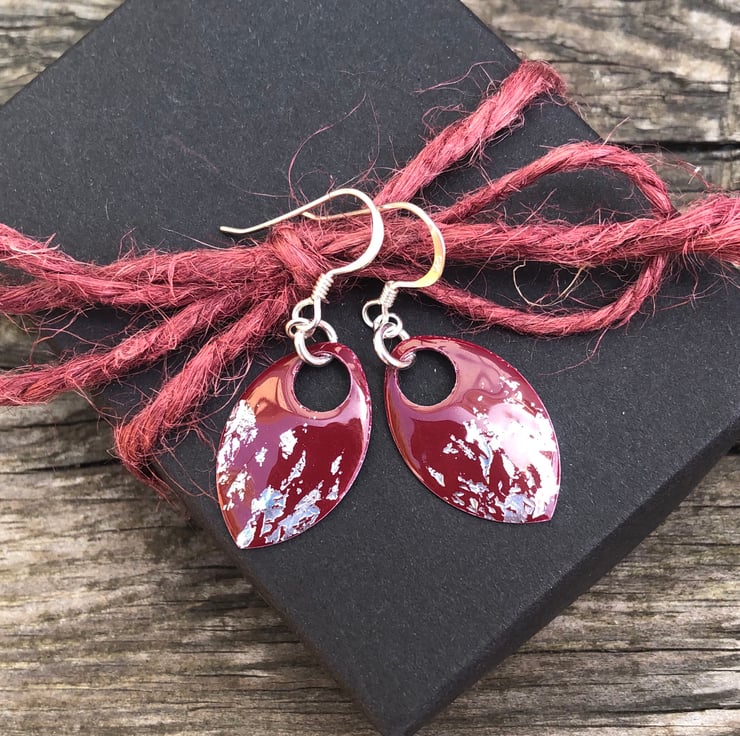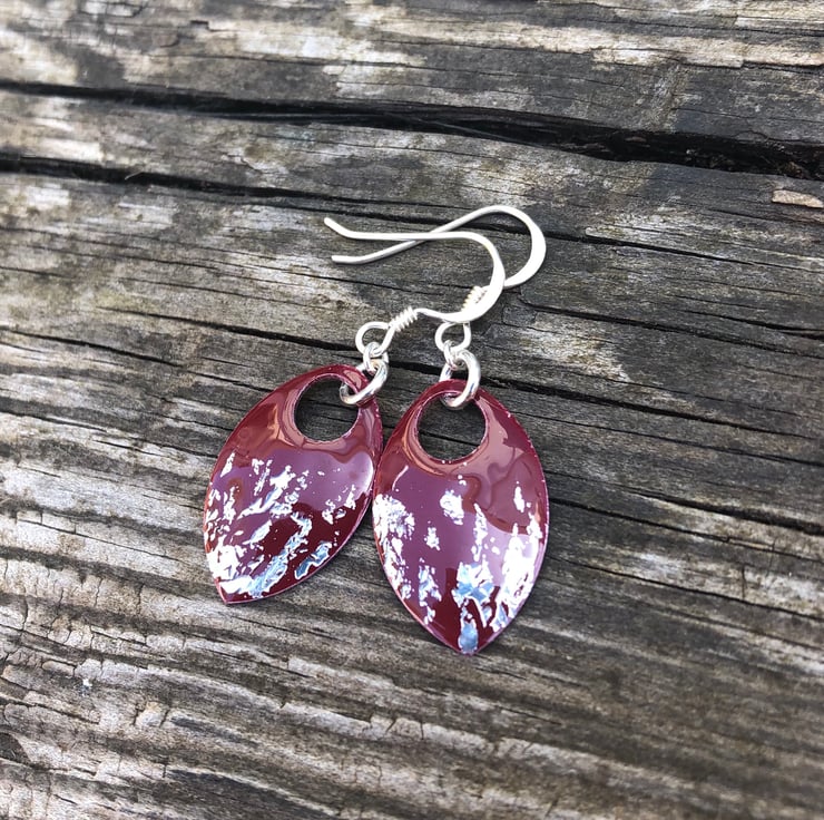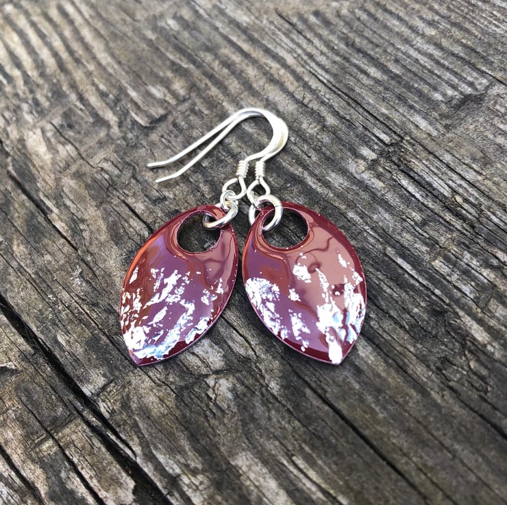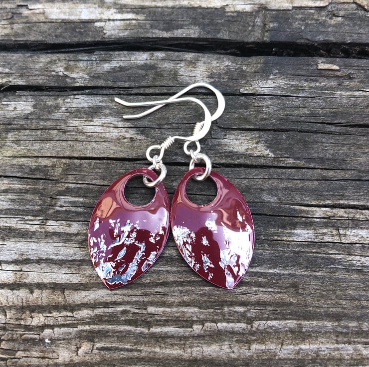 Dark red and silver leaf enamel scale earrings. Sterling silver.