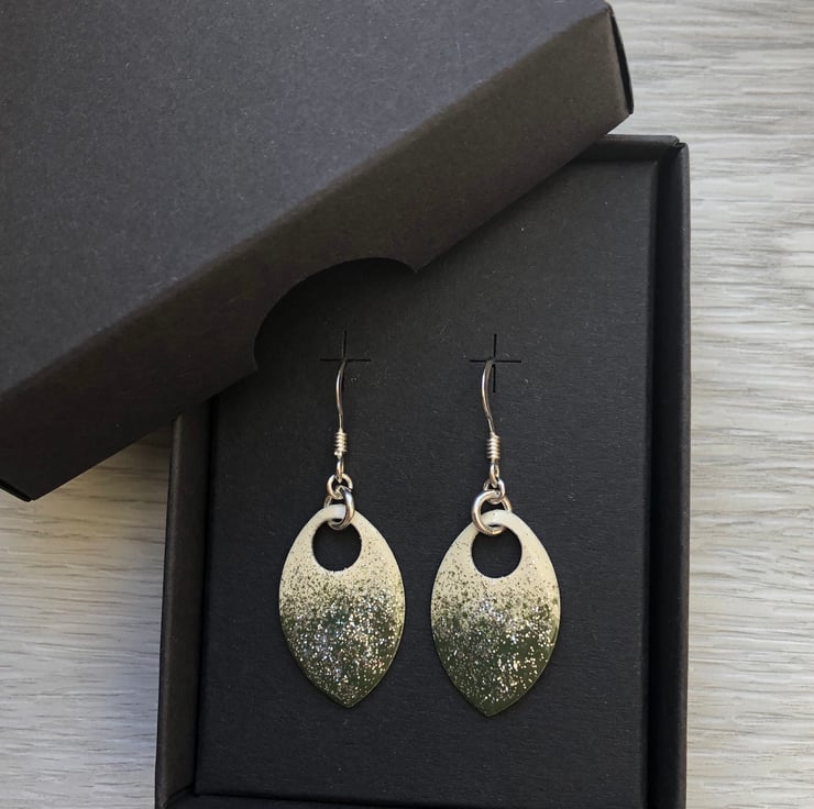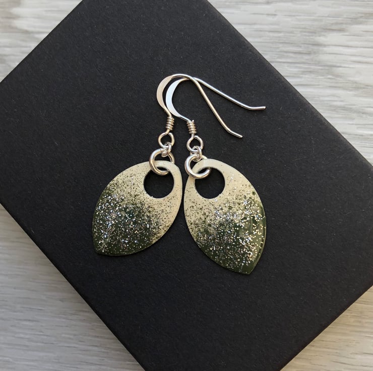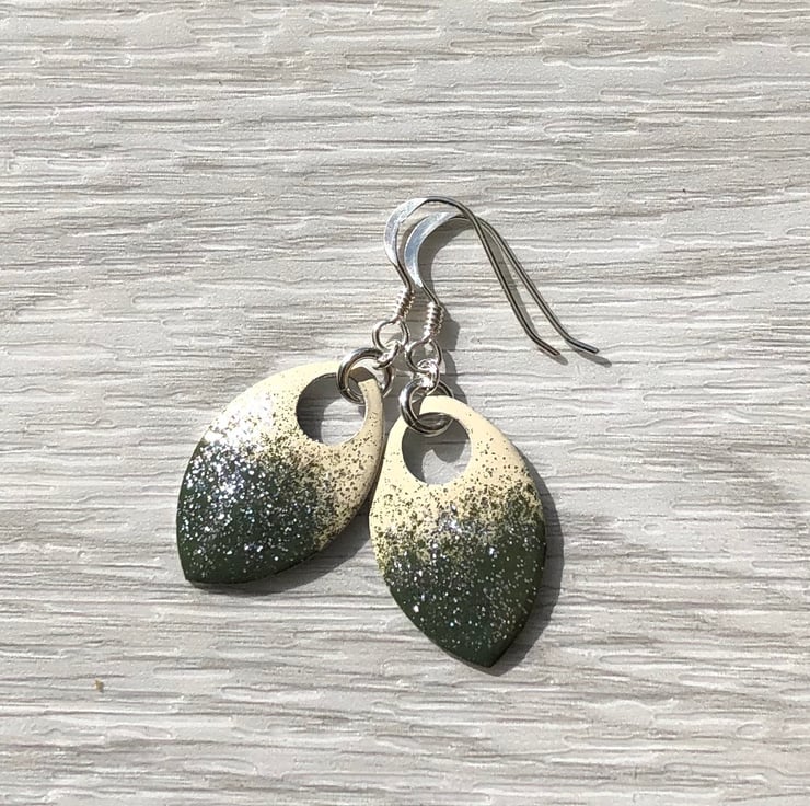 Super light weight aluminium scales have been hand enamelled in a number of layers of cold enamel. These hang from sterling silver fish hook earrings using sterling silver jump rings.