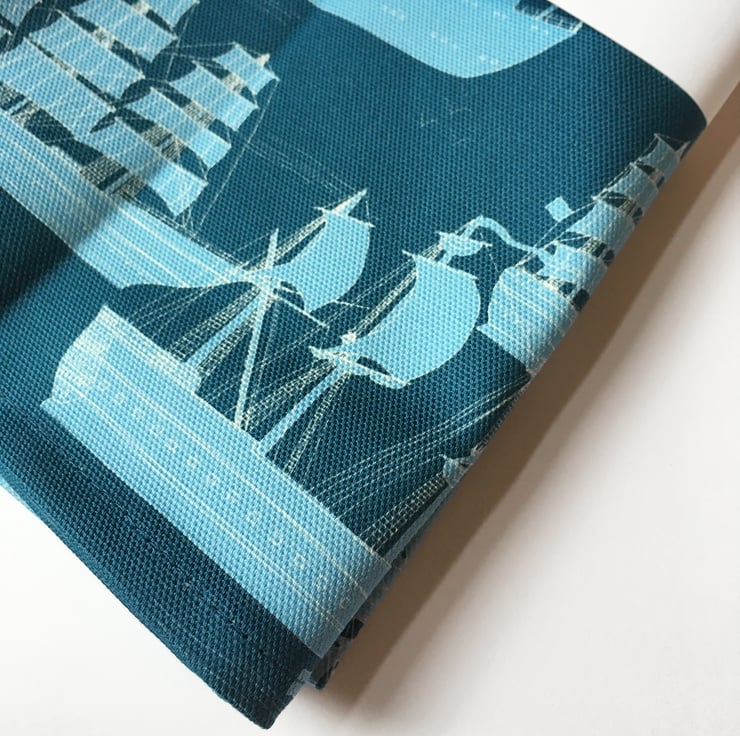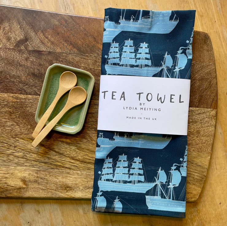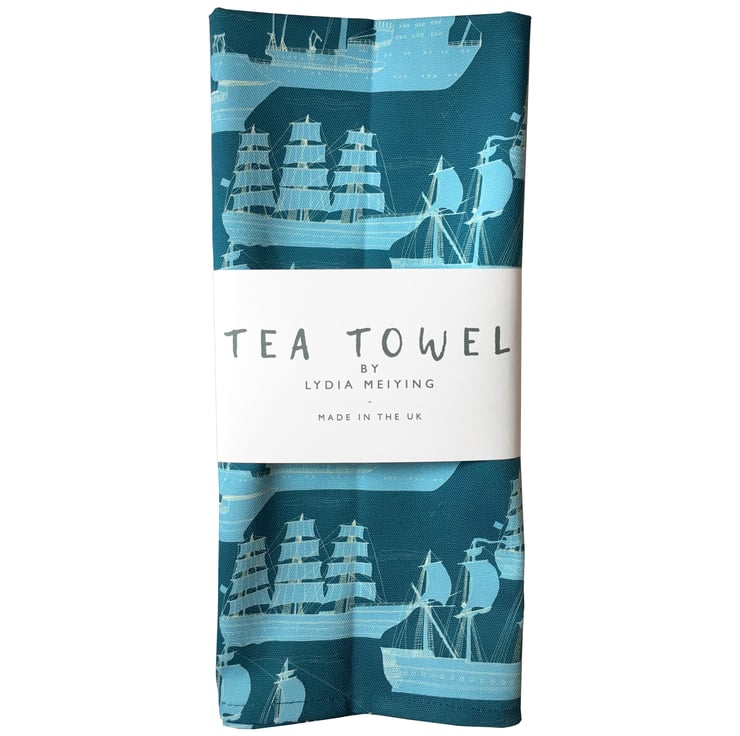 A tea towel featuring a collection of boats and ships, a perfect addition to any kitchen.