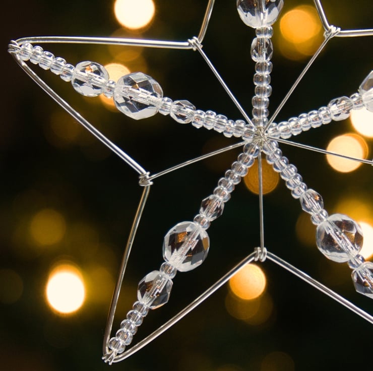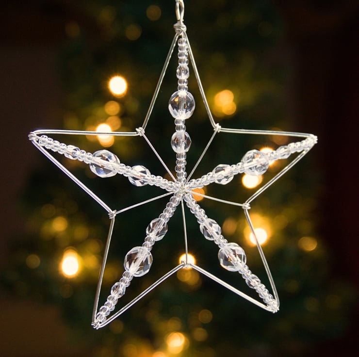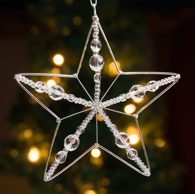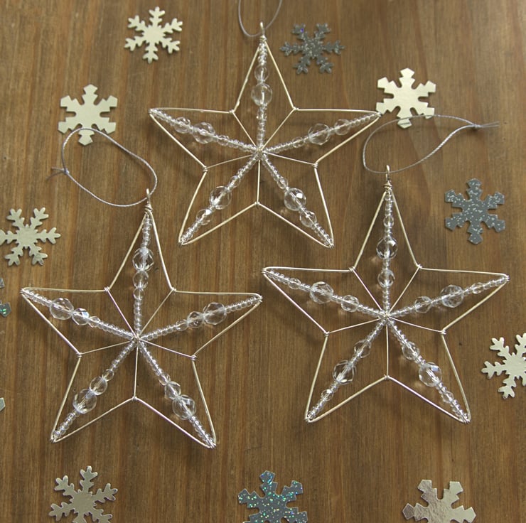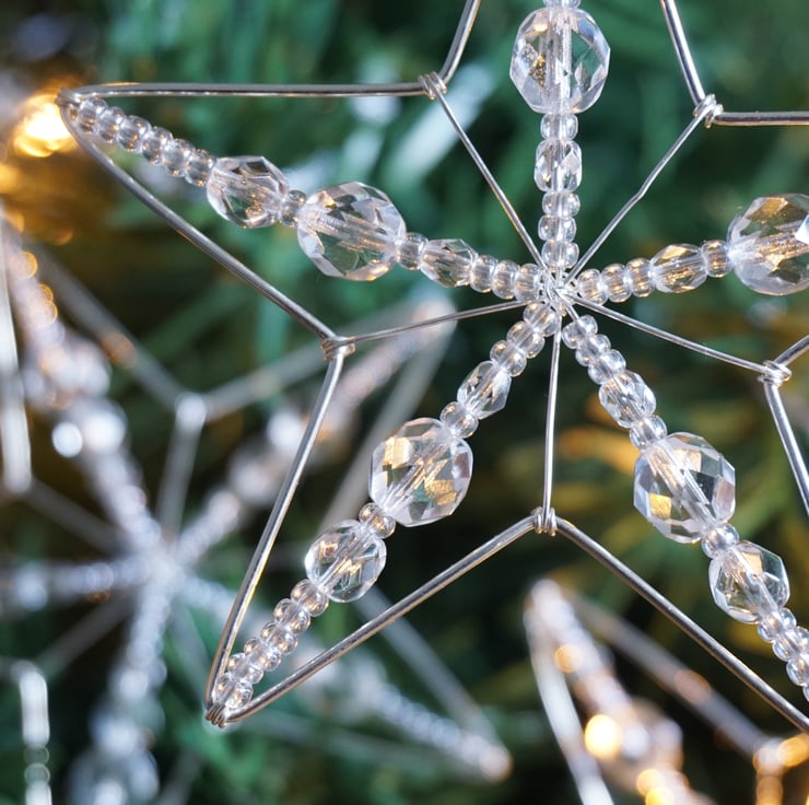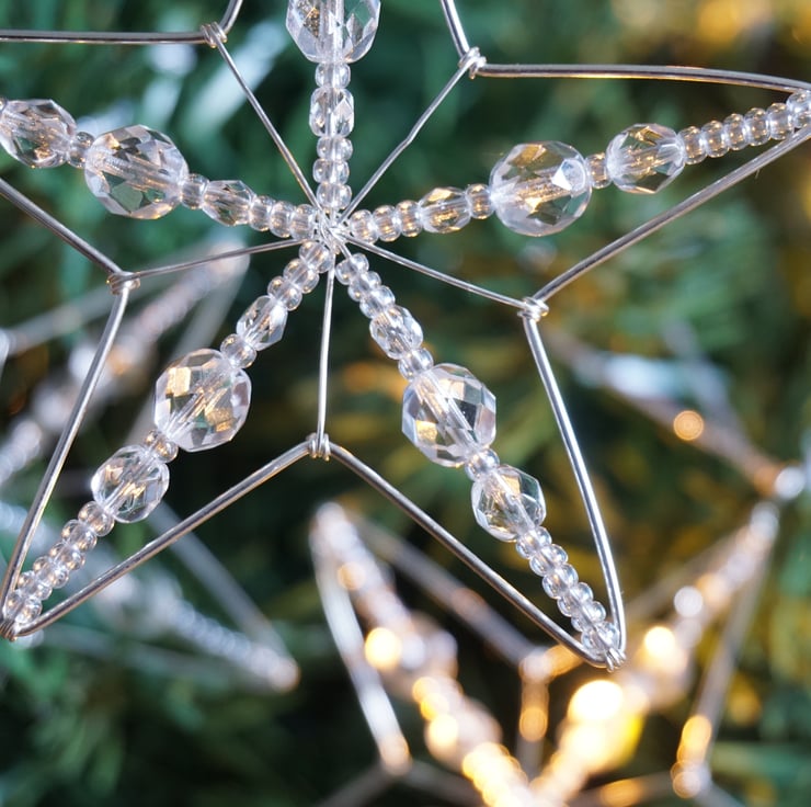 A set of three handmade wire star decorations. I've formed star shapes from silver plated copper wire, & then added a mix of translucent seed beads, 8mm, 6mm & 4mm glass crystal faceted beads. Each star has a slightly different bead pattern. These stars really twinkle, especially next to some fairy lights!